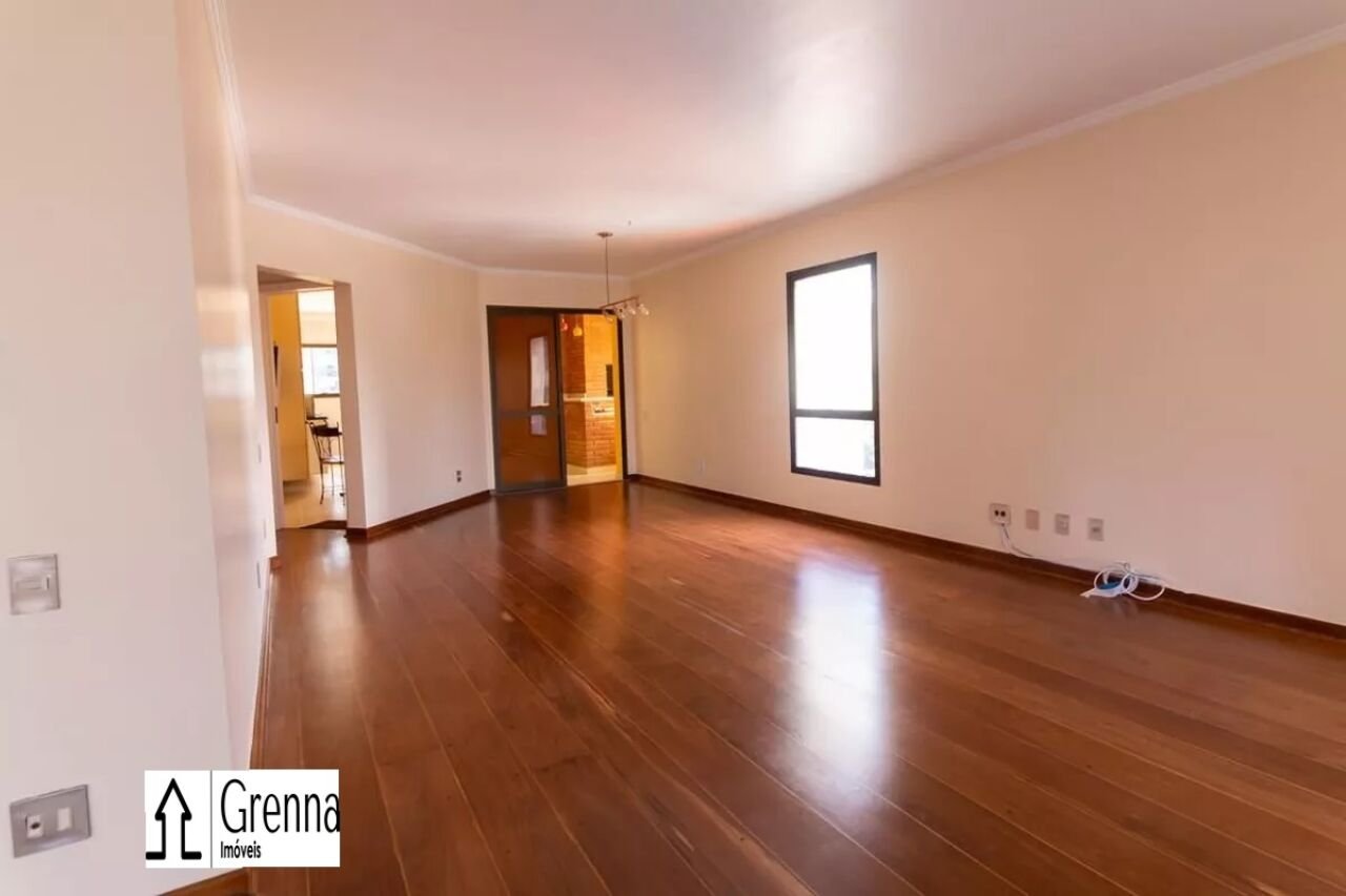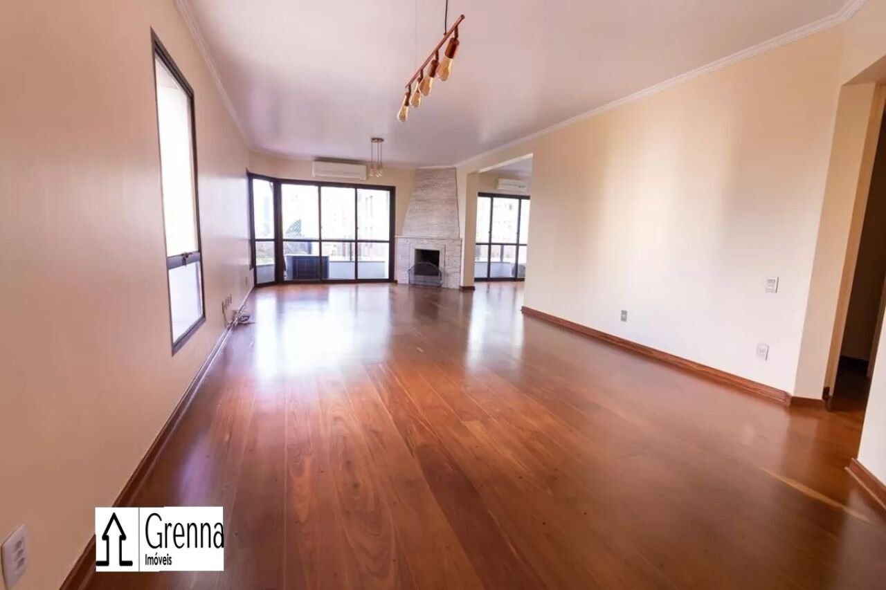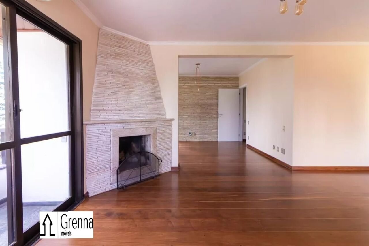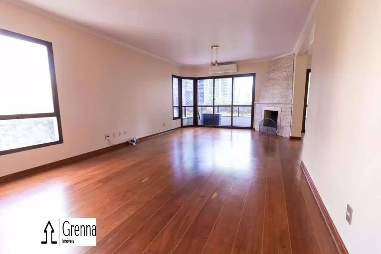 Apartamento com living para dois ambientes com ar condicionado, lareira e varanda. Cozinha com armários e churrasqueira, área de serviço e dependência de empregada. Três suítes com armários e ar condicionado. Chuveiros a gás. Duas vagas de garagem.