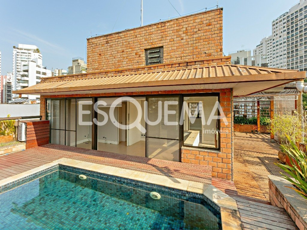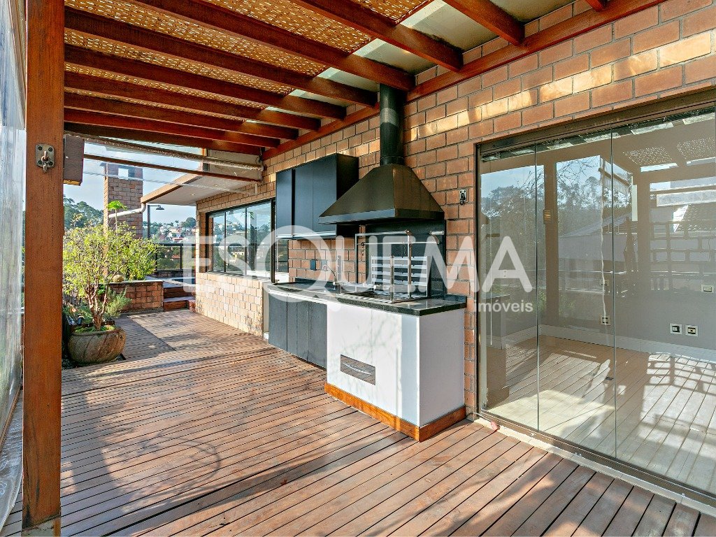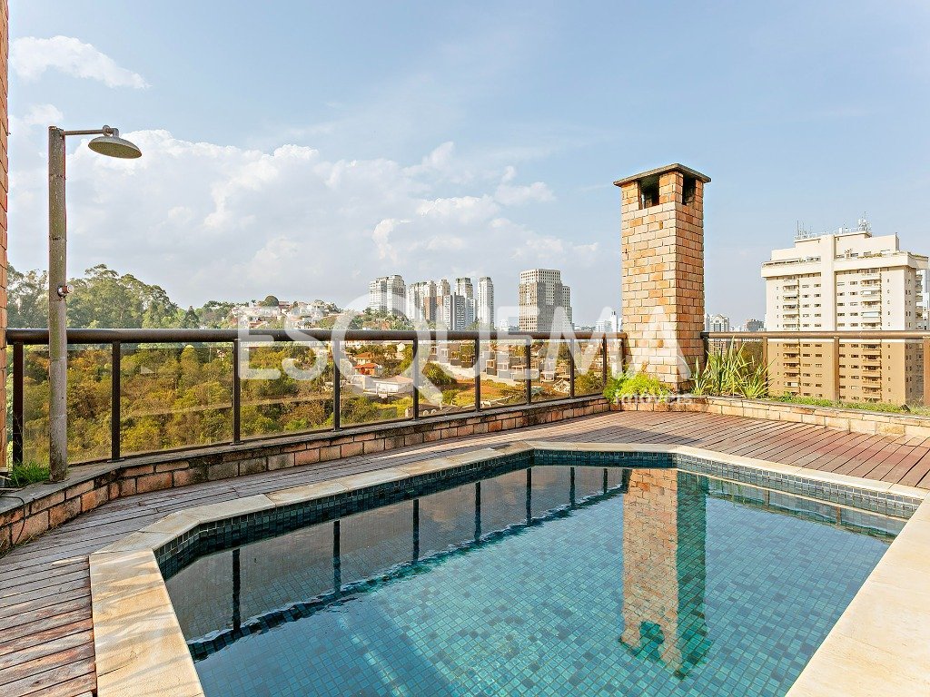 Cobertura duplex de 420 m², com área externa que reúne piscina e espaço gourmet voltados para o verde. No piso inferior, o amplo living para 2 ambientes se integra à sala com lareira e ao terraço. A cozinha americana, equipada e funcional, tem piso em granito preto, ilha em inox com cooktop e coifa, além de lavanderia e dependência para funcionários. A área íntima oferece 5 suítes confortáveis. No piso superior, dois ambientes adicionais se conectam à área externa com piscina e espaço gourmet, criando um cenário perfeito para lazer e convivência. São 4 vagas de garagem.