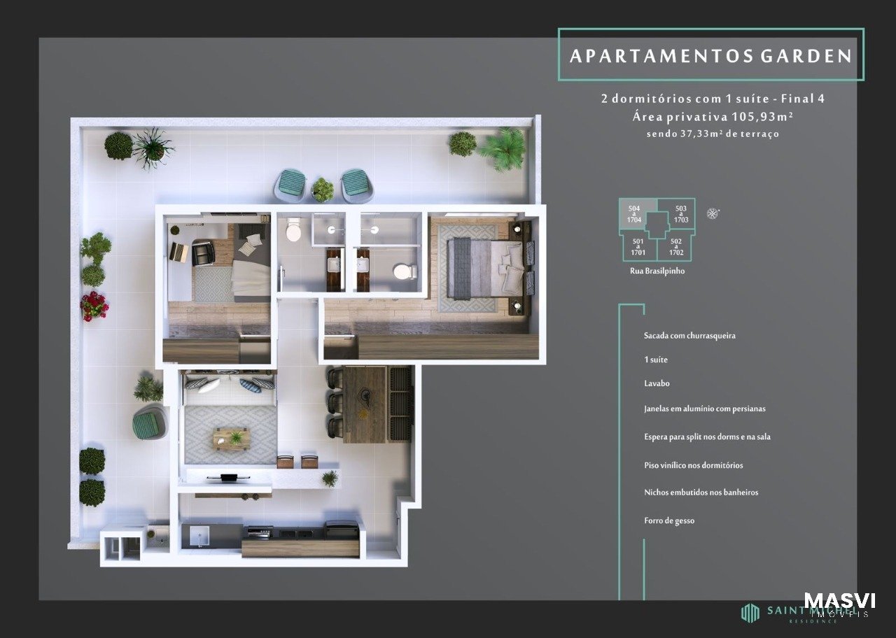 Lindo apartamento no Kobrasol, 02 quartos sendo 01 suíte, living 02 ambientes, cozinha, área de serviço, lavabo e sacada com churrasqueira a carvão e amplo terraço. Janelas em alumínio com persianas, espera para split nos quartos e na sala, piso vinílico nos quartos, nichos embutidos nos banheiros, forro de gesso.