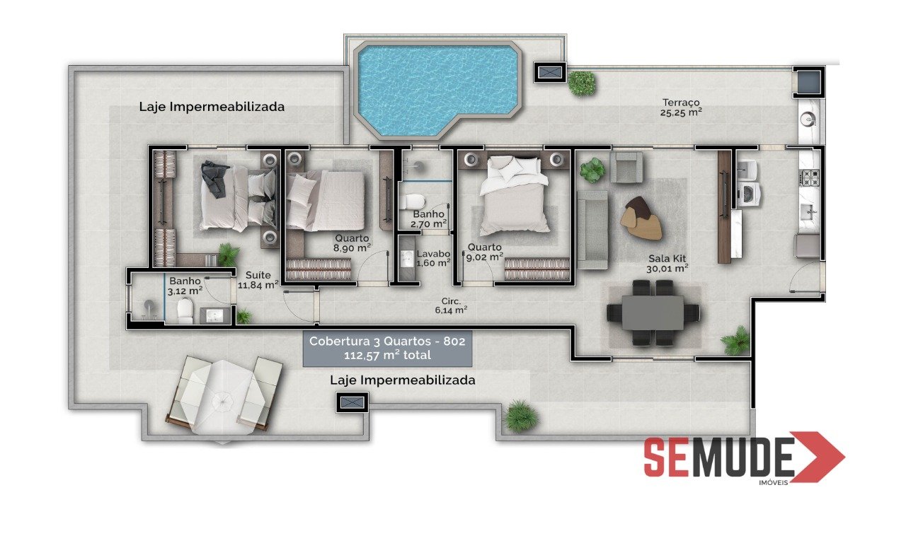 Cobertura plana de 3 dormitórios sendo 1 suíte, amplo terraço com piscina e sacada com churrasqueira, sala de estar e jantar, banheiro social, voltado para fundos com vista para o verde e para o hotel, ao pôr do sol, 2 vagas de garagem individuais.