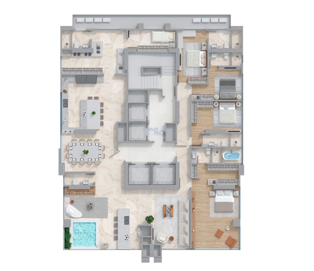 APARTAMENTO 04 Suítes, sendo 01 máster com hidromassagem Living integrado Espaço gourmet com piscina privativa Varanda ampla Lavabo Área de serviço com dependência de empregada 03 Vagas de garagem Área privativa de 288,30m² ÁREA DE LAZER 1.200m² de área de lazer Piscina adulto e infantil Piscina aquecida Espaço gourmet Spa com hidromassagem Bar molhado Fire place 02 salões de festas Brinquedoteca Playground Academia Sala de jogos Sauna Espaço pet Quadra de esportes Rooftop EMPREENDIMENTO 44 Pavimentos 04 Elevadores 02 Apartamentos por andar 08 Unidades duplex 11 Unidades de penthouse 32 Apartamentos tipo Estacionamento rotativo para visitantes Guarita de segurança Paredes acústicas Bicicletário Entrega prevista para 2028