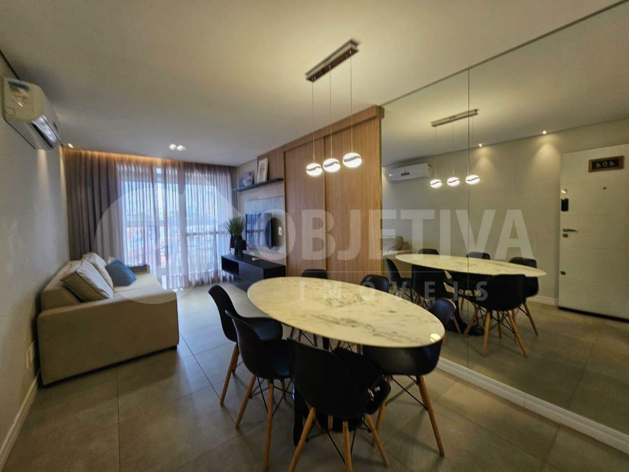 Apartamento totalmente mobiliado disponível para aluguel no bairro Santa Monica próximo ao pátio sabia, prefeitura e center shopping, com 70m². Possui duas salas amplas, sendo uma com mesa de seis cadeiras, espelho, sofá retrátil de dois lugares, painel com TV de 42 polegadas e sacada fechada em blindex com armário e cortinas. Decoração e montagem impecáveis, iluminação especial, painéis, cortinas, espelhos e móveis de primeira linha. Em andar alto com belíssima vista. A cozinha em estilo americano é completa, com armários, fogão de indução, micro-ondas e geladeira. A área de serviço conta com máquina de lavar e varal de roupas. O corredor dá acesso a dois quartos, sendo uma suíte com box, espelho, chuveiro, cama de casal e cabeceira, e outro quarto com cama de solteiro, painel para TV e mesa de escritório. O apartamento possui piso em porcelanato, banheiro social com box, armário e espelho, ar-condicionado na sala, elevador e portaria com fechadura eletrônica. Para o conforto do morador o prédio tem uma academia completa com aparelhos novos de primeira qualidade, e um amplo salão de festas. Entre em contato, vamos te ajudar na negociação.