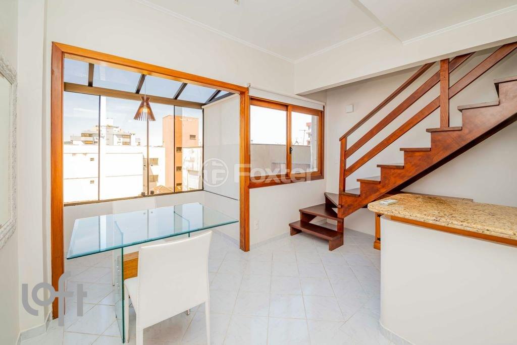 conteúdo removido vende apartamento duplex, com vista perene, à venda no bairro Petrópolis, com 1 dormitório e área privativa de 38,13m² e área total de 100,22m², lateral. No 1º pavimento possui lavabo, living para dois ambientes integrado à uma ampla sacada, cozinha americana e acesso em escada em madeira ao pavimento superior. Esse, com dormitório, armários, banheiro e piso em madeira. Imóvel com aberturas amplas, proporcionando bastante ventilação e iluminação direta. Vendido como está nas fotos. Possui uma vaga coberta, por convenção. Situado em com elevador, porteiro eletrônico, salão de festas com churrasqueira, terraço coletivo e lavanderia. Ótima localização, junto ao comércio do bairro, facilidade de deslocamento para as principais vias da cidade, linhas de ônibus em frente, inclusive para as universidades PUC e UFRGS. Próximo a ESEF e Shopping Bourbon Ipiranga, Ideal para estudantes. Agende sua visita!
