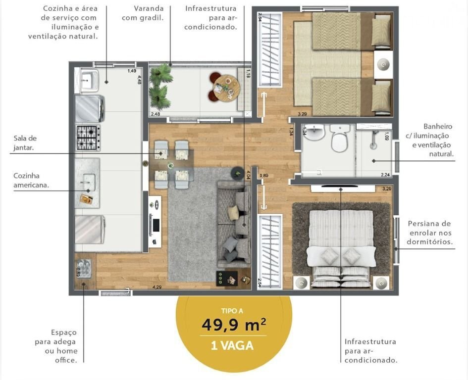Apartamento à venda no Condomínio Califórnia Boulevard - Ótima Localização - 02 Dormitórios com infraestrutura para ar-condicionado. Sala de estar com sacada. Cozinha americana. Área de serviço com iluminação e ventilação natural, banheiro, 1 vaga de garagem. O apartamento será entregue com piso e box nos dois banheiros. Área de lazer completa com 15 itens de lazer, entre eles, piscina, academia, redário, playground e brinquedoteca.