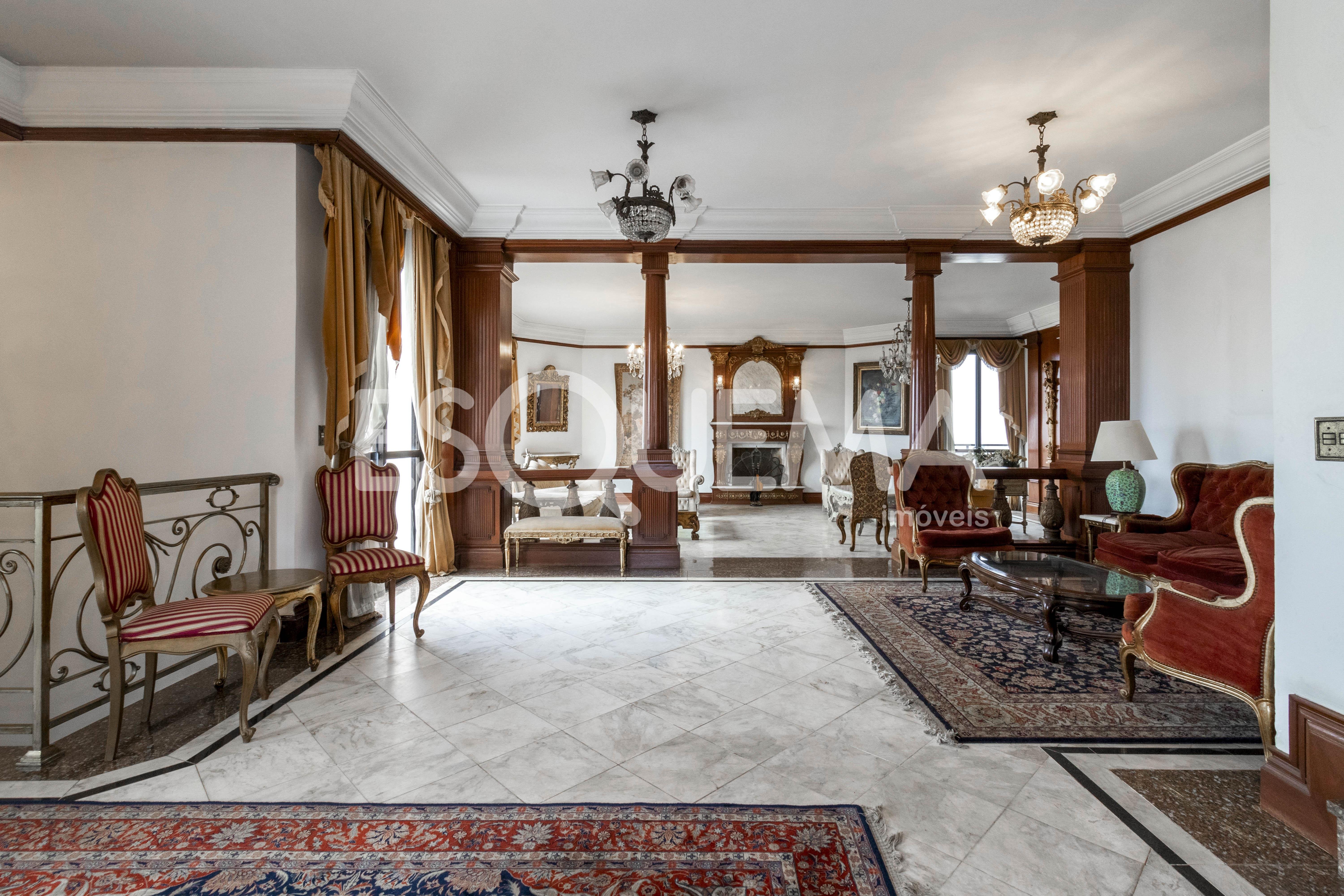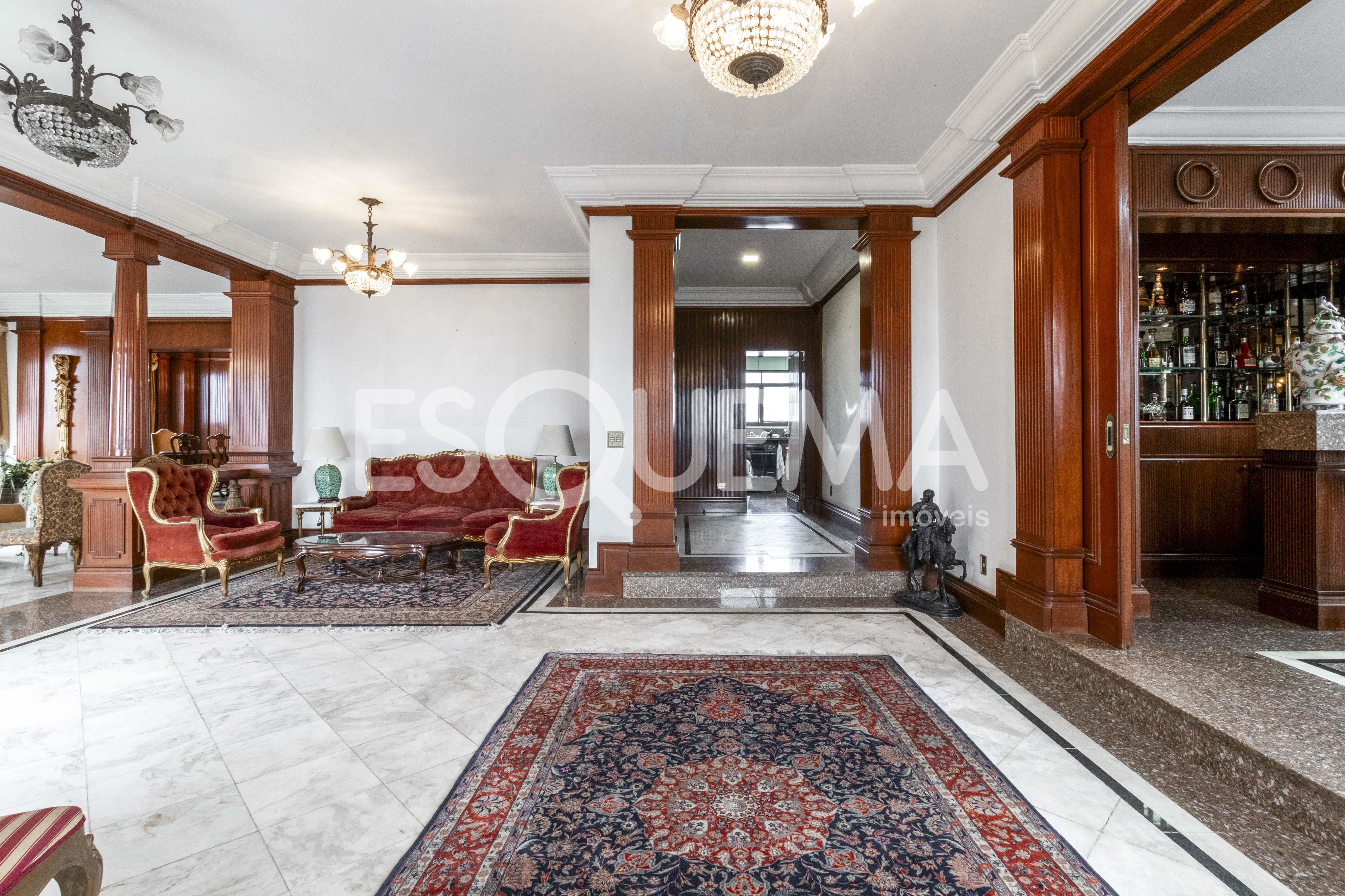 Localizado em Higienópolis, um dos bairros mais arborizados de São Paulo, perto das melhores conveniências e comodidades como bancos, farmácias, padarias, restaurantes, cercado de escolas e faculdades como Rio Branco, Sion, Mackenzie e FAAP, e a uma curta distância do Shopping Pátio Higienópolis. Cobertura triplex, com 836 m², estilo clássico, com marcenaria em mogno, amplo e arejado, e possui pé direito alto. Living para vários ambientes. Na área íntima, são 4 suítes, sendo a máster com 120 m², banheiros para Senhor e Senhora, além de dois terraços. Sala de TV e área de serviço com dependência de funcionários. Piscina, solarium e brinquedoteca. Vagas para 6 carros.