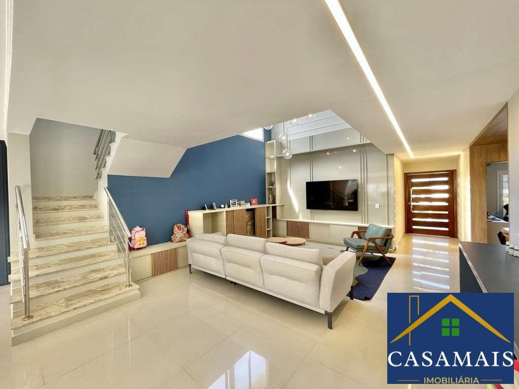 Linda casa contemporânea / moderna, com ótimo acabamento. Envidraçada, ensolarada, bem arejada e iluminada. Imóvel repleto de planejados decorativos refinados, de qualidade e bom gosto. Portas e janelas externas com persianas elétricas nos quartos. Pisos em porcelanato, taco de madeira e Fulget. Projeto de gesso e iluminação. Louças e metais de qualidade. Jardim com paisagismo. 2 acessos: social e serviço / lazer. Hall de entrada social por um porta pivotante imponente. Lavabo com tampo em mármore, espelho e gabinete. Escritório / sala de TV com ar condicionado. Escada de alvenaria, revestida em Travertino, com guarda corpo de metal. Hall íntimo no piso superior. Grande aparador com 6 gavetas e roupeiro. 4 suítes com ar condicionado e persianas elétricas. 3 com armários e 2 com terraços. A master com closet. Banheiros com espelho, tampos em Travertino, gabinetes e box de vidro, sendo a master com espelho grande, 2 cubas, 2 duchas e box de vidro até o teto. Living para 4 ambientes voltados para o lazer. Com anexo gourmet, quintal, piscina e jardim. Estar, lareira, jantar, bar. Anexo gourmet com churrasqueira, bancada em granito, 2 cubas inox. Vestiário com box de vidro e lavatório externo. Piscina de alvenaria adulto e infantil revestida em vinil, com piso antiderrapante, solarium e casa de máquinas. Copa cozinha com porta de correr, repleta de armários planejados, banca de granito em L, 2 cubas inox e despensa. Área de serviço aberta ensolarada e lavanderia fechada com tanque e armários. Suíte de serviço revertida em despensa com banheiro. Garagem para 4 vagas, sendo 2 cobertas com depósito. Aquecimento central de água: Boiler - Solar com suporte elétrico. Abastecimento de água: Municipal. Armazenamento de água: 3 mil litros.