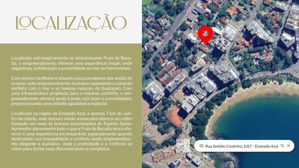 Apresentamos um dos lançamentos mais aguardados de Guarapari, localizado na charmosa praia da Bacutia, conhecida por sua beleza natural e mar de águas cristalinas. Este empreendimento foi projetado para quem valoriza conforto, praticidade e um estilo de vida conectado à natureza, unindo segurança, sustentabilidade, comodidade e conexão em um só lugar. Os apartamentos contam com 2 quartos, sendo ambos suítes, com metragens que variam de 69 m² a 79 m², além de opções de gardens exclusivos de 78 m² a 100 m², ideais para quem deseja um espaço extra para convivência ou lazer ao ar livre. Todos os imóveis possuem 1 vaga de garagem, ambientes integrados, cozinha ampla, área de serviço funcional, sala de jantar e TV com excelente iluminação natural, além de espera para Split e vista panorâmica que valoriza ainda mais o projeto. A infraestrutura do condomínio é completa e pensada para atender a todos os públicos. Conta com piscina coletiva, playground, salão de festas, sala de jogos, sauna coletiva, brinquedoteca, churrasqueira coletiva, elevadores social e de serviço, estacionamento, portaria 24h, circuito interno de TV, interfone e portão eletrônico, garantindo conforto e segurança em tempo integral. Os diferenciais do empreendimento vão além da localização privilegiada: ele foi planejado com foco em sustentabilidade e bem-estar, utilizando soluções inteligentes que reduzem o impacto ambiental e aumentam a eficiência energética. Além disso, a estrutura oferece comodidade e conectividade, proporcionando uma experiência residencial completa para quem busca um novo padrão de qualidade de vida. Com quatro colunas bem distribuídas, o projeto garante privacidade e ventilação cruzada em todos os apartamentos. O condomínio é pet friendly, permitindo que toda a família, inclusive os animais de estimação, desfrute de um ambiente harmonioso e acolhedor. Seja para morar ou investir, este lançamento na Bacutia é uma oportunidade única de viver com estilo e exclusividade em uma das regiões mais valorizadas do litoral capixaba. Valores sujeitos a alteração sem aviso prévio.