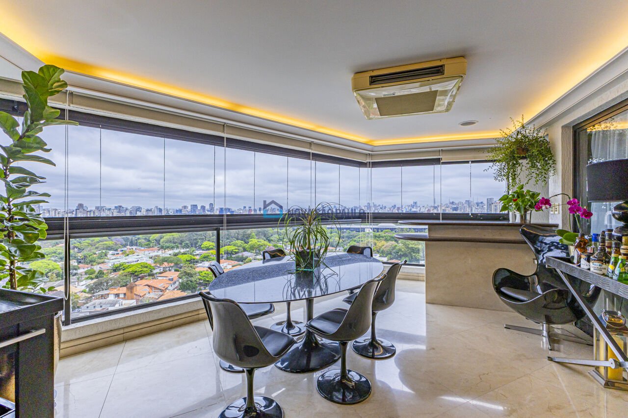 Apartamento em andar alto, com vista panorâmica para o skyline da cidade e para o Parque Ibirapuera. São 4 dormitórios, todos suítes, sala íntima, banheiros completos, banheira de hidromassagem, lavabo, hall privativo, sala espaçosa para vários ambientes integrada à sala de jantar e ampla varanda gourmet envidraçada com churrasqueira. A cozinha planejada conta com copa e despensa, além de área de serviço com dois tanques, dependência completa de serviço e depósito privativo walk-in. O imóvel é envidraçado, possui vista 360°, sonorização e ar-condicionado em todos os ambientes. Dispõe de 4 vagas grandes de garagem. O condomínio é isolado e recuado, com apenas um apartamento por andar, hall com pé-direito duplo, piscina, quadra de tênis, academia completa, estacionamento para visitantes, sistema de segurança com portaria 24 horas presencial e é pet friendly. Localizado em rua tranquila e arborizada, próximo ao Parque Ibirapuera, hospitais, clubes e a poucos metros da estação de metrô. Oferecemos assessoria gratuita em financiamento imobiliário; orientando o cliente em todo o processo de negociação. Você pode agendar sua visita ou tirar dúvidas.