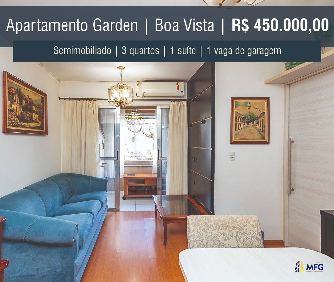 Este apartamento garden é ideal para quem busca tranquilidade e praticidade em uma das melhores localizações do bairro Boa Vista, com ambientes bem distribuídos, ventilação natural e uma charmosa área privativa. - DESTAQUES DO IMÓVEL - - Garden privativo coberto - Ambientes bem aproveitados e iluminados - Sala para dois ambientes, com sacada integrada - Sacada fechada com vidro, churrasqueira a carvão e grade pantográfica - Cozinha com armários planejados - Lavanderia independente - 3 dormitórios com armários (sendo 1 suíte) - 1 dos quartos adaptado como closet - Banheiro social com ventilação natural - Banheiro da suíte com barra de segurança e box acessível - Ar-condicionado - Pantográficas em todas as janelas - 1 vaga de garagem coberta (matrícula individual) - Acesso por 1 lance de escadas a partir da garagem - DADOS DO IMÓVEL - - Área privativa: 57,67 m² - Área total: 71,60 m² - Quartos: 3 (1 suíte) - Banheiros: 2 - Cozinha e lavanderia separadas - Vaga de garagem: 1 coberta e exclusiva - Face solar: Norte/Oeste - IPTU apartamento: R$ 314,54 - IPTU garagem: R$ 114,75 - SOBRE O CONDOMÍNIO - - Idade: 13 anos (Construção: 2012) - Portaria com interfone - Acesso com tag (pedestres) e controle remoto (veículos) - Sistema de segurança com câmeras e vigilância privada - Permite pets - Valor mensal: R$ 300,74 (inclui água e fundo de reserva) - Elevador: Não - LOCALIZAÇÃO - O imóvel está situado em uma área residencial tranquila no bairro Boa Vista, região norte de Curitiba. Um bairro arborizado, familiar, com infraestrutura completa e fácil acesso ao centro da cidade (apenas 8 km). Bairros vizinhos: Bacacheri, Santa Cândida e Ahú. - DISTÂNCIAS - - Supermercado: 3 min - Farmácia: 3 min - Terminal: 5 min - Rua da Cidadania: 8 min - Terminal