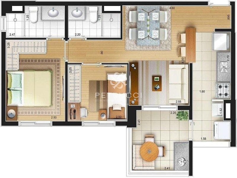 Apartamento de 57m², com 2 dormitórios sendo 1 suíte, sala para 2 ambientes, varanda grill e 1 vaga de garagem. Conta com gabinetes na cozinha e banheiros, aquecedor, box e espelhos. O condomínio oferece toda a área de lazer para a família e uma localização excelente. Venha conhecer!