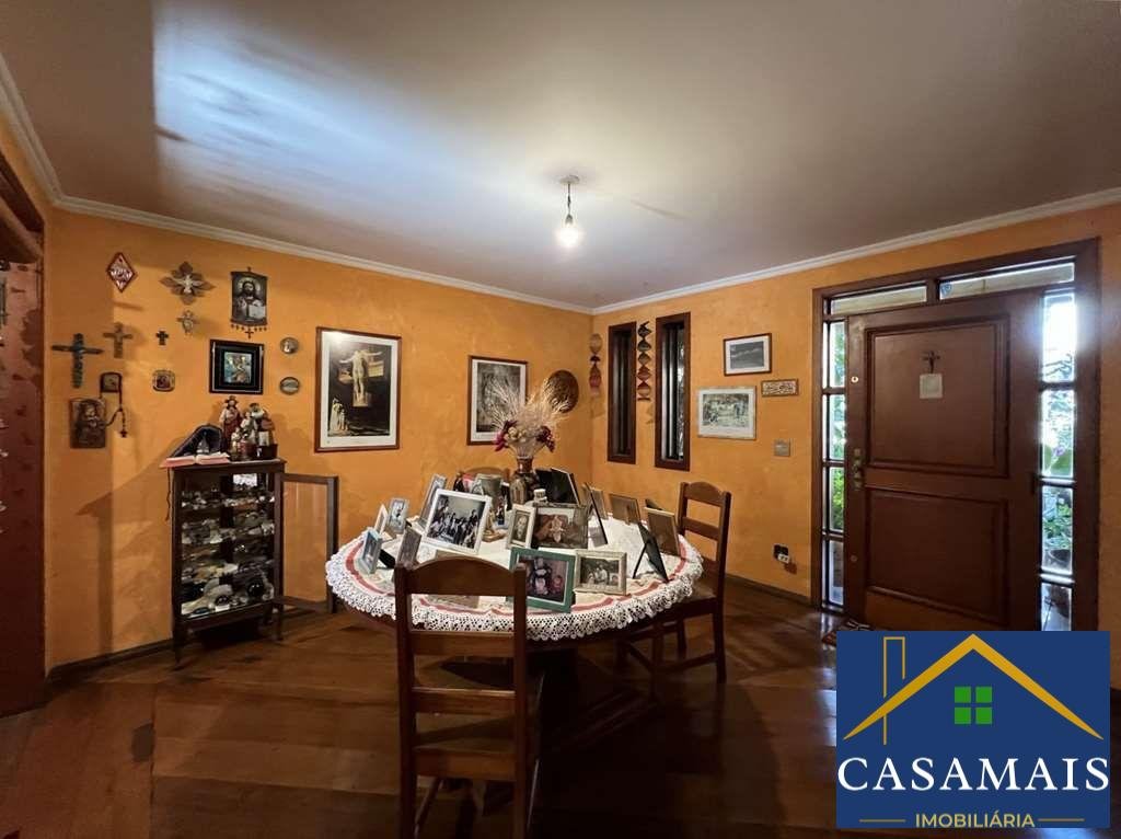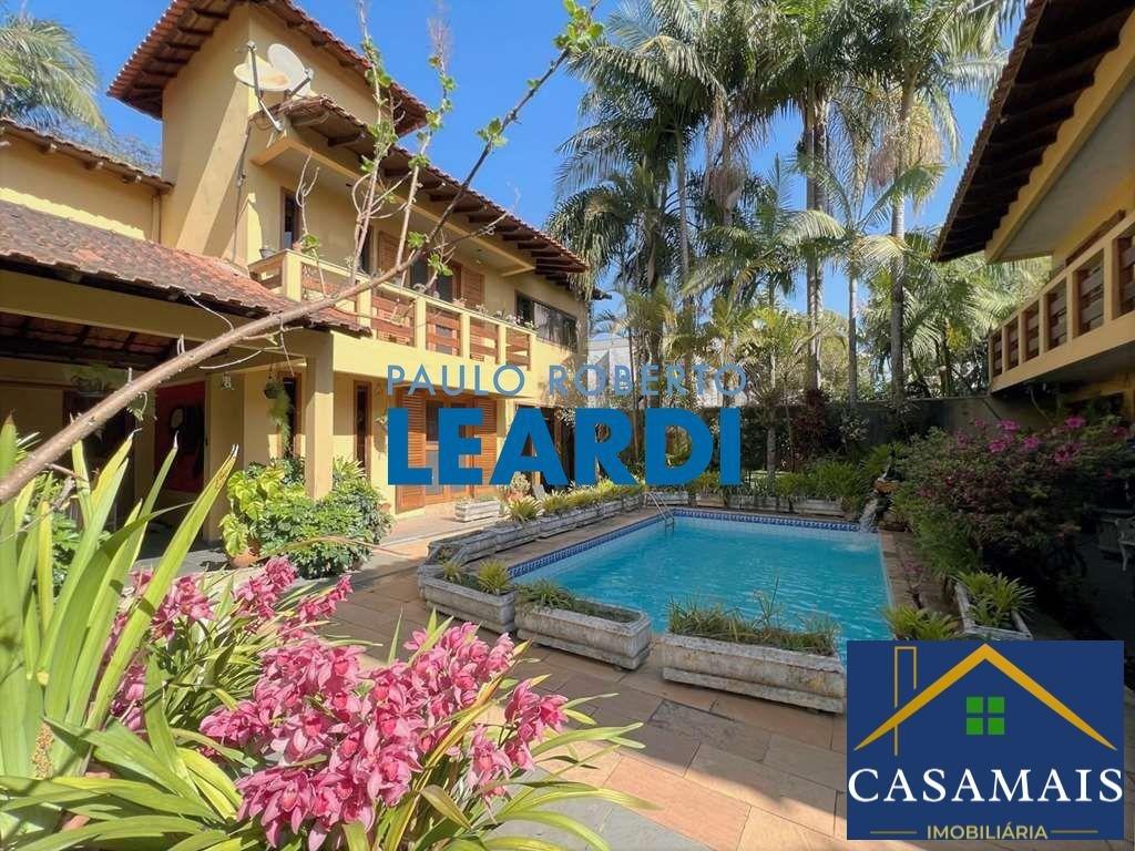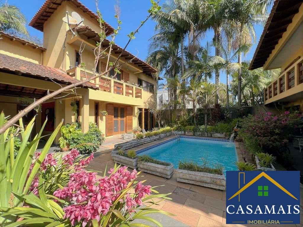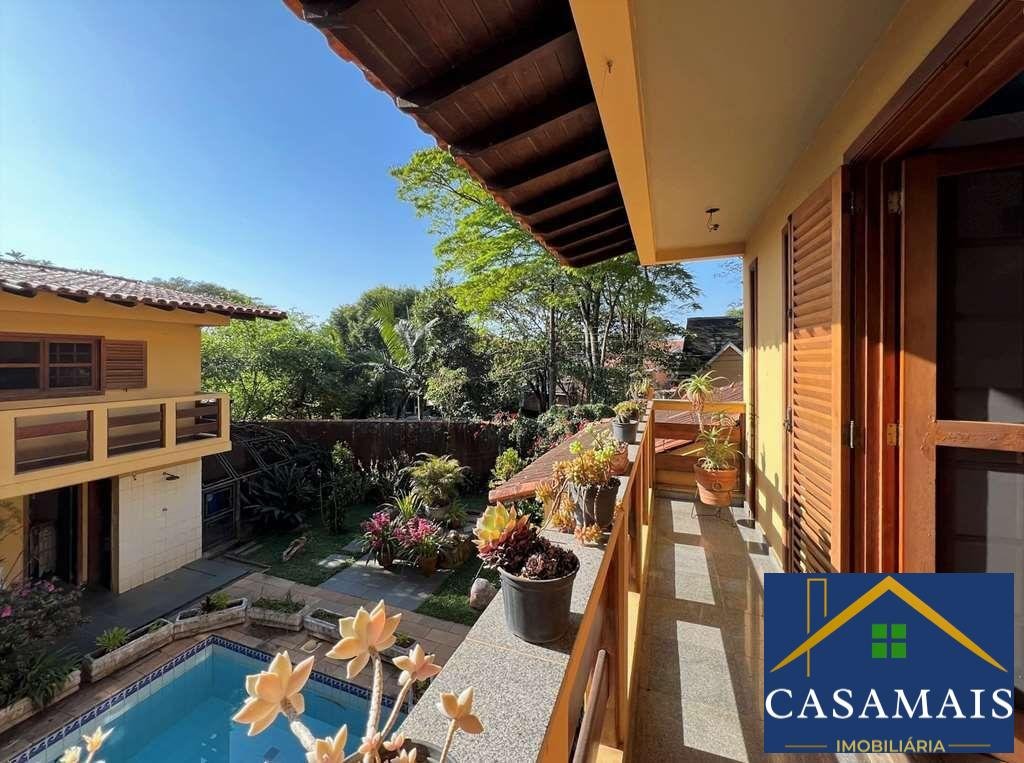 Muro em concreto usinado. Madeiramento nobre maciço em Cedro Rosa: Portas balcão, janelas, armários e móveis. Madeiramento nobre maciço em Ipê: guarda corpo das varandas e assoalho. Pisos em tábuas largas, cerâmica, pedras Granito, Miracema e São Tomé. Telas nas portas e janelas dos quartos e escritório. Acessos: social, lazer e serviço. Hall de entrada social. Lavabo. Escritório / Home theater com porta de correr, armários e portas balcão com veneziana, tela e vidro, para o jardim com piscina. Escada de alvenaria revestida de madeira com guarda corpo de madeira. Hall íntimo na parte superior, family room com armários, ideal para home theater ou escritório. Dormitórios com armários em madeira maciça, ventiladores e portas balcão com veneziana, tela e vidro, para os terraços com guarda corpo de madeira, sendo uma suíte com grande closet. Banheiros com espelho, bancadas em granito, gabinete e box de vidro, sendo a máster com hidro. Entrada social. Living para 5 ambientes voltados para quintal com lazer e jardim. Salas de jantar com armário para louças e prataria, bar, estar, lareira em tijolos e biblioteca. Piscina de alvenaria 7m x 4m, revestida em azulejos, com cascata em pedras Quartzito, ducha, solarium. Edícula - Anexo gourmet: Churrasqueira, forno de pizza, bancada, pia, vestiário e depósito / espaço sauna. Anexo hóspedes ou serviço piso superior: 2 dormitórios, sendo 1 suíte e um grande terraço. Lindo jardim formado com diversas espécies de plantas e flores. Cozinha com sala de almoço, porta de correr, repleta de armários e aparador, em madeira maciça de marcenaria sob medida. Bancada em "L" em granito, 2 cubas inox e despensa com prateleiras em granito. Área de serviço aberta ensolarada e lavanderia fechada com tanque inox. Garagem para 4 vagas cobertas. 2 vagas dentro e 2 vagas fora. Aquecimento de água: solar