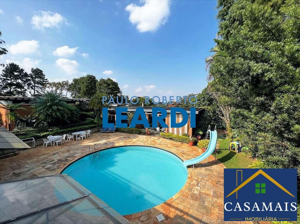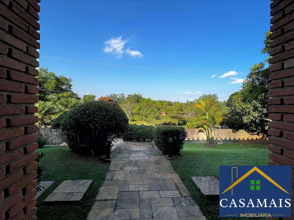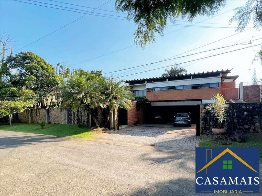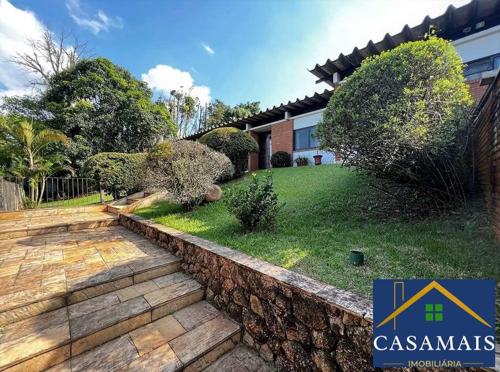 Na melhor rua do condomínio, parte mais alta e no centro do condomínio, linda casa com arquitetura contemporânea, 80% TÉRREA, tijolos aparentes e detalhes em pedra, integrada e com ótimo acabamento. Envidraçada, ensolarada, bem arejada e iluminada. Projeto com muita personalidade, com uma circulação interna excepcional. Imóvel repleto de armários. Portas e janelas em madeira e vidro. Pisos em ardósia, tábuas largas, revestimento de madeira, cerâmica, pedra mineira. Louças e metais de qualidade. Jardim com paisagismo formado. Frutíferas: manga, jabuticaba e laranja. 4 acessos: social, lazer, garagem e serviço. Entrada social pelo jardim. Hall de entrada por uma porta dupla de madeira. Lavabo com claraboia e tampo de madeira. Family Room com home theater e lareira com detalhes em mármore. Hall de circulação interna muito eficiente, distribuindo acesso direto às áreas social, íntima, serviço e garagem por uma escada interna. Hall íntimo com roupeiro e maleiro com vista para o jardim. 4 suítes, sendo 3 suítes com closets, armários e ar condicionado, 2 com ventiladores. A master com lareira e saleta para TV ou escritório, com closet. 4 Banheiros com tampo de madeira, espelho, gabinetes e box de vidro, sendo 3 com lavatório externo e a master uma sala de banho com jardim interno, 2 cubas e hidro. Living para 4 ambientes, voltados para varanda e lazer com piscina. Salas de estar para 2 ambientes, bar e jantar mais reservada com uma parede de espelho. Sala de almoço, com bancada, armários e ventilador. Cozinha repleta de armários e gabinetes planejados, bancada de granito em U com 2 cubas inox, e despensa. Fogão 5 bocas. Área de serviço aberta ensolarada e lavanderia fechada com tanque, armários e despensa. Dependências de serviço com 1 banheiro e 2 quartos.
