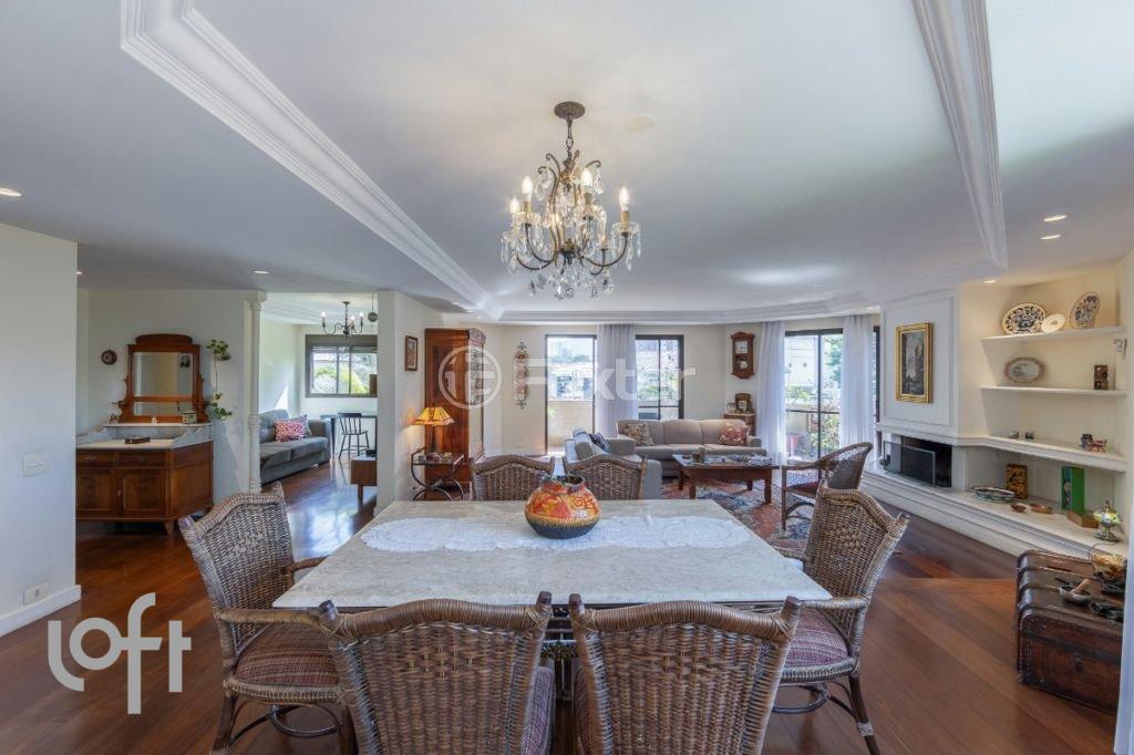 Apartamento com linda vista para a copa das árvores, sala para 3 ambientes com lavabo e um amplo terraço. Sala de estar com lareira criando um ambiente muito aconchegante. Saindo da sala temos uma boa antessala que leva aos dormitórios, onde temos 3 suítes com sacada e ar condicionado, sendo que a suíte master tem closet, além de uma sala de TV que é o quarto quarto e pode ser facilmente revertido. Sala com piso em tábuas, banheiros com piso em granito. Ampla cozinha e copa, 02 dependências de empregada com banheiro. Um grande diferencial do apartamento é que além de gerador para o elevador e áreas comuns, o apartamento possui três tomadas selecionadas alimentadas com energia pelo gerador. O Campo Belo é conhecido pelas ruas arborizadas e pela atmosfera tranquila. Mas não é nada isolado, entre os pontos vizinhos estão Parque Ibirapuera, Aeroporto de Congonhas e dois centros empresariais da cidade, a Vila Olímpia e a Berrini.