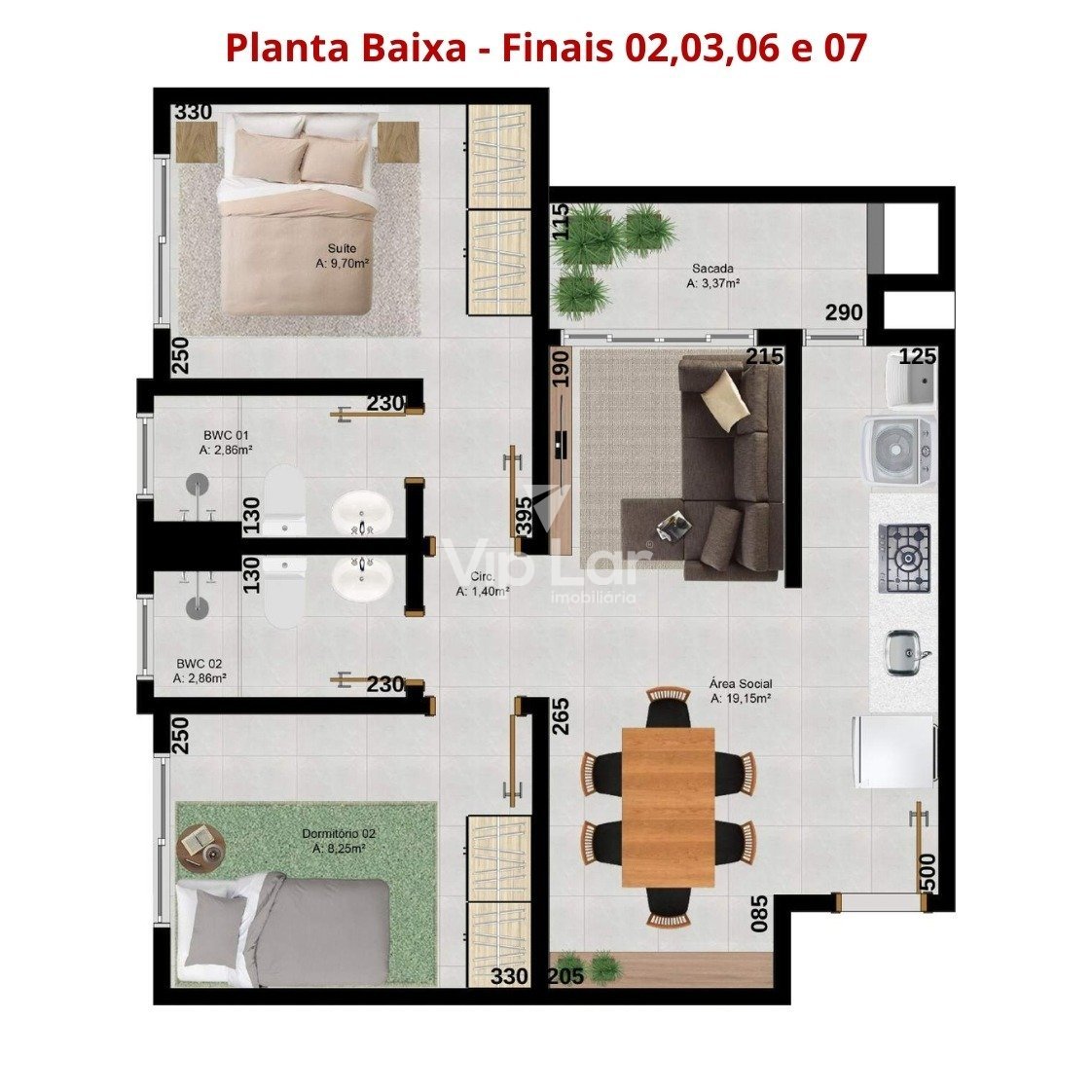 2 Elevadores 2 pavimentos de garagem coberta Dois quartos, um com suíte Espera para split Medidores individuais para água, energia e gás Placas solares para área comum Playground Salão de Festas Tubulação seca para vigilância Varanda com churrasqueira à carvão