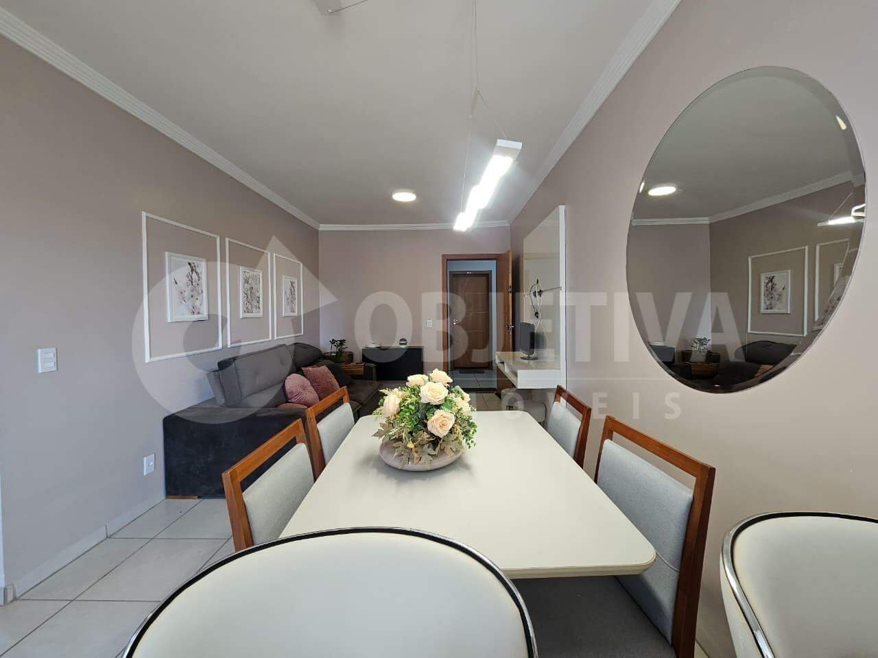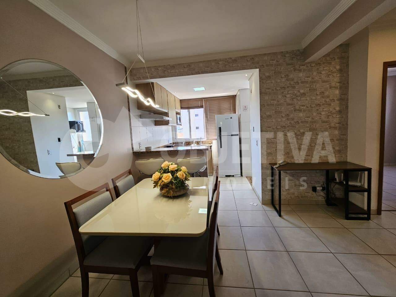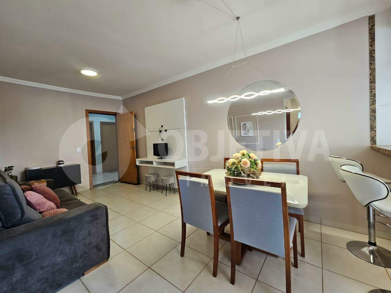 Apartamento Semi Mobiliado para Aluguel - Localização: Bairro Segismundo Pereira, alto do Santa Monica. Características do Prédio: Prédio com 3 andares e muito tranquilo e familiar, Segundo andar (sem elevador), 1 vaga de garagem, Salão de festas, Água inclusa no condomínio, Valor condomínio R$ 150,00. Descrição do Apartamento: Área total: 62 metros quadrados, Ambientes: Sala ampla, Cozinha, Suíte, 2 Quartos, Banheiro social, Lavanderia. - Itens Inclusos: Armários planejados em todos os quartos; Espelhos; Cortinas nos quartos; Persianas planejadas; Painel de TV na sala; Painel de TV no quarto; Pintura nova. Ar condicionado suíte - Móveis e Eletrodomésticos: Mesa com 4 cadeiras novas de vidro e pés com madeira maciça, 2 banquetas brancas, Tapete grande para sala de estar, Duas mesas de escritório, Geladeira, Micro-ondas, Forno elétrico, fogão Cooktop elétrico, Sofá retrátil novo, Filtro soft de água gelada e natural, Panelas básicas, Talheres básicos, Vasos de flores artificiais decorativo para mesa da sala, Lustre com pendente de iluminação, Chuveiros elétricos instalados em todos os banheiros. Iluminação completa, Criado-mudo no quarto com abajur, Aparador na sala. | Observações: Aproveite a comodidade de um apartamento mobiliado, pronto para morar, em uma localização tranquila e agradável.