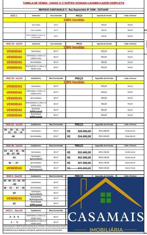 🏡 Empreendimento LANÇAMENTO COTIA -SP O Refúgio Cantagalo 5, em Cotia, oferece o endereço ideal para uma vida harmoniosa com a natureza, situado em uma localização estratégica no ponto mais elevado do Bairro. A apenas 5 minutos da Raposo Tavares, o empreendimento proporciona fácil acesso a diversos mercados, bancos, Pronto Socorro, transporte público e uma ampla variedade de comodidades. O bairro conta com farmácias, padarias, depósitos, cartório e tudo o que você e sua família necessitam para viver com qualidade de vida! 🌳 Terreno amplo: 10.000m² de área total 🏡 Plantas exclusivas: Cada casa com 60m² de área privativa, oferecendo conforto e funcionalidade! 🔑 Diferenciais: 2 suítes amplas Lavabo moderno Living espaçoso integrado com a cozinha Quintal privativo entre 14,55m² e 33,8m² 2 vagas de garagem por unidade 🏊 Lazer completo para toda a família: Piscina adulto e infantil 2 churrasqueiras Playground Quadra poliesportiva Salão de festas 🏗️ Construção de qualidade: Paredes com argamassa estrutural armada, núcleo em EPS, proporcionando excelente conforto térmico e acústico. 📍 Localizado em um ambiente tranquilo e cercado de verde, perfeito para quem busca qualidade de vida. 🔑 Disponíveis 32 unidades à venda! (COM VARIÁVEIS DE VALORES R$ 329.900,00 A R$ 350.300,00 DEPENDENDO DO TAMANHO ETC. Entre em contato e garanta a sua casa! ÁGUA E LUZ SEPARADOS 🏡 PAREDE EM ARGAMASSA ESTRUTURAL ARMADA COM NÚCLEO EM EPS PARA CONFORTO TÉRMICO E ACÚSTICO SUPERIOR