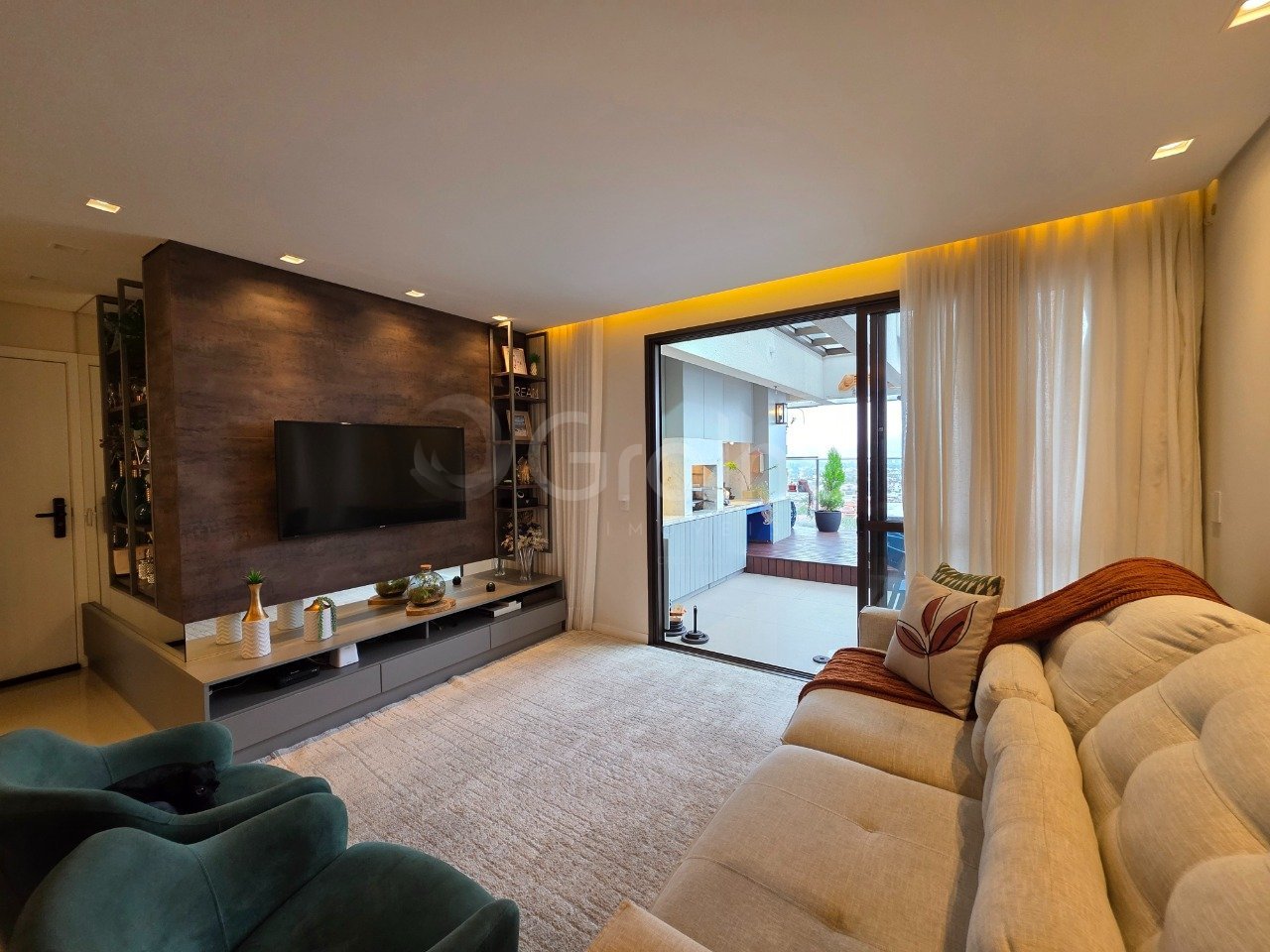 Cobertura com vista panorâmica, terraço gourmet com jacuzzi. Cozinha integrada com estar e jantar, lavabo, uma generosa área de serviço e lavabo. Na área íntima, suíte com closet, dois dormitórios e banheiro social. Móveis planejados de alto padrão, ar condicionado, teto rebaixado com projeto luminotécnico. Conforto, sofisticação e qualidade de vida. Três vagas de garagem e hobby box. No bairro Itacorubi com fácil acesso e muito verde no entorno. Venha conhecer e se encantar.
