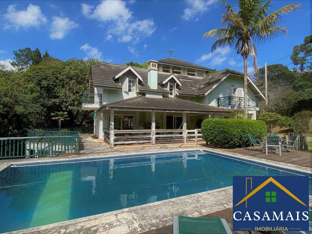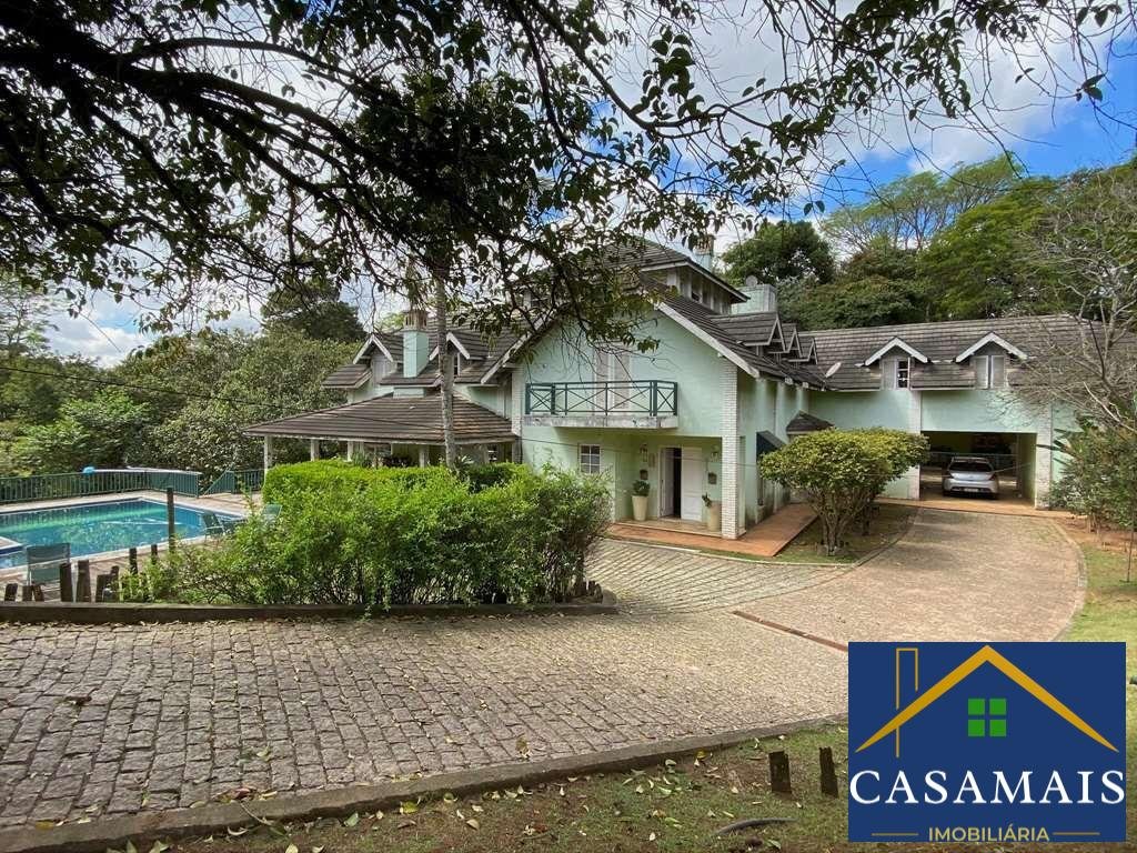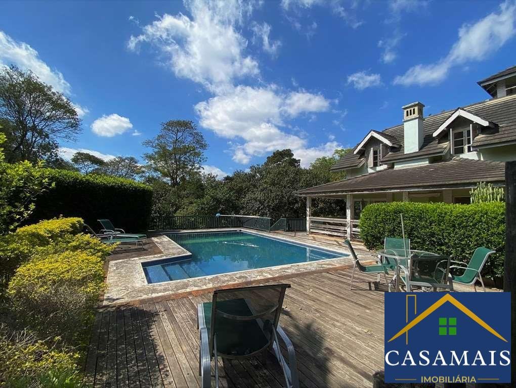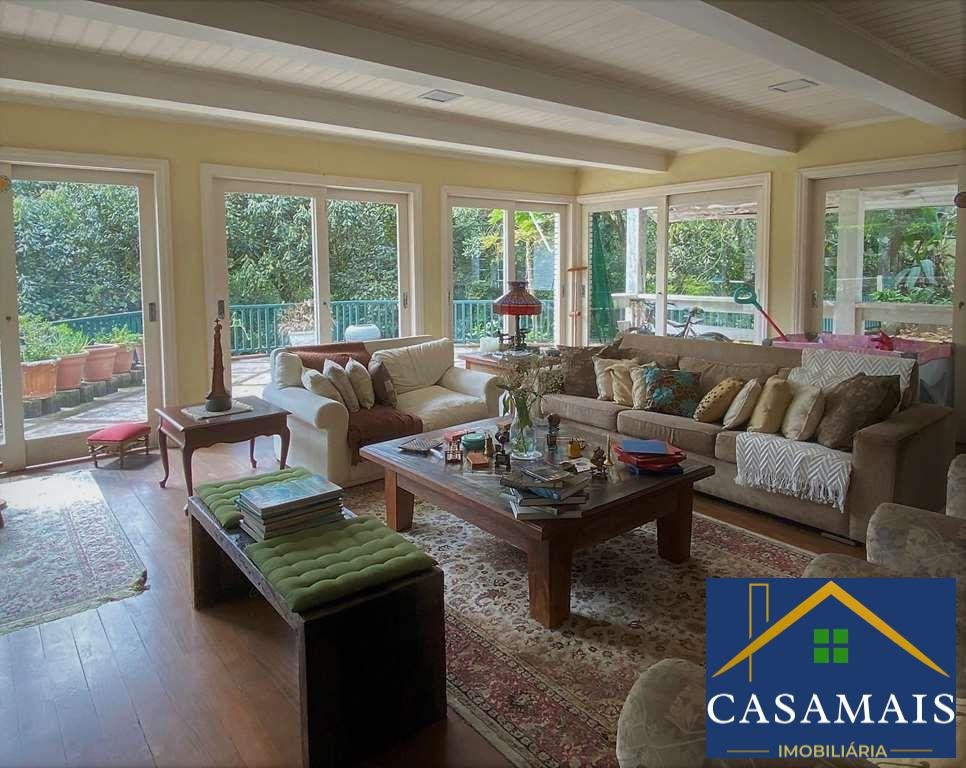 - Lindo projeto do renomado arquiteto, estilo Colonial Americano. - Casa muito bem construída, com acabamentos primorosos. - Envidraçada, arejada e bem iluminada. - Imóvel repleto de armários de marcenaria artesanal. - Portas emolduradas e janelas em madeira. - Louças e metais de qualidade. - Pisos em mármore, tábuas largas, ladrilho hidráulico, cerâmica, paralelepípedo, cimento, tijolos, ardósia e decks. - Telhas de concreto. - 3 entradas: social, lazer e serviço. - Hall de entrada social e de distribuição, dando acesso ao living, adega, área íntima e área de serviço. - Lavabo. - Escada de acesso para área íntima e adega, revestida de madeira com corrimão de madeira. - Adega grande no subsolo. - 2 Halls íntimos no piso superior, um com acesso pela área social e outro com roupeiro pela área de serviço. - Family Room ideal para home theater. - 4 suítes. Aptos completos com closets repletos de armários, sendo 3 com saletas, 1 deles com mezanino e a máster com terraço e vista. - Banheiros com espelho, gabinetes, box de vidro e bidê. Sendo a máster com lavatório externo, 2 cubas, hidro e claraboias. - Sítio multiuso com lareira. Ótimo espaço ideal para escritório, estudo e jogos. - Living para 4 ambientes voltados para varanda cercada e grande terraço panorâmico para quintal com lazer e jardim. - Salas de estar, lareira com frontão em Pinho de Riga, TV, bar e jantar mais reservada, voltada para outra varanda e quintal. - Espaço gourmet integrado à sala de jantar e cozinha, com teto em vidro, quebra sol e ladrilho hidráulico. Com churrasqueira, forno de pizza, bancada em silestone. Pia, balcão, gabinetes e parede em lambril em Pinho de Riga. - Quiosque externo no pátio com pia, para dar suporte em festas. - Piscina de alvenaria (10m x 5m com 1,80m profundidade), escada interna, deck, ducha e solarium