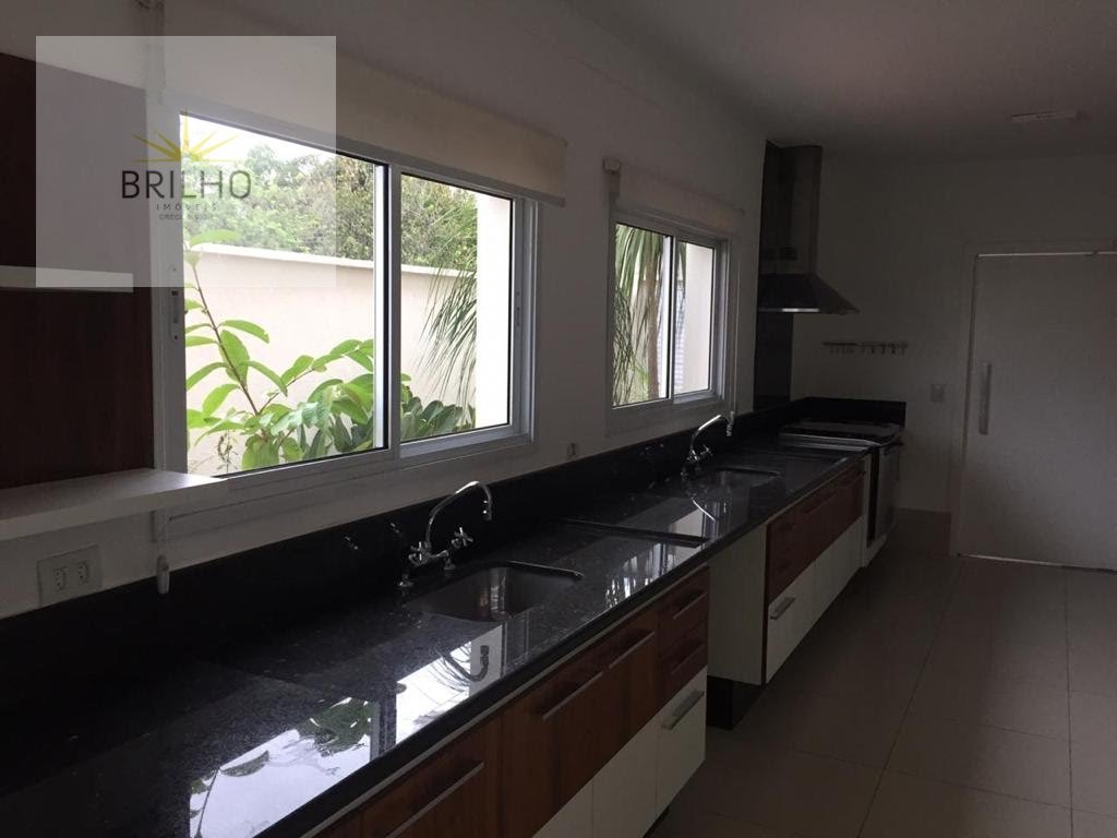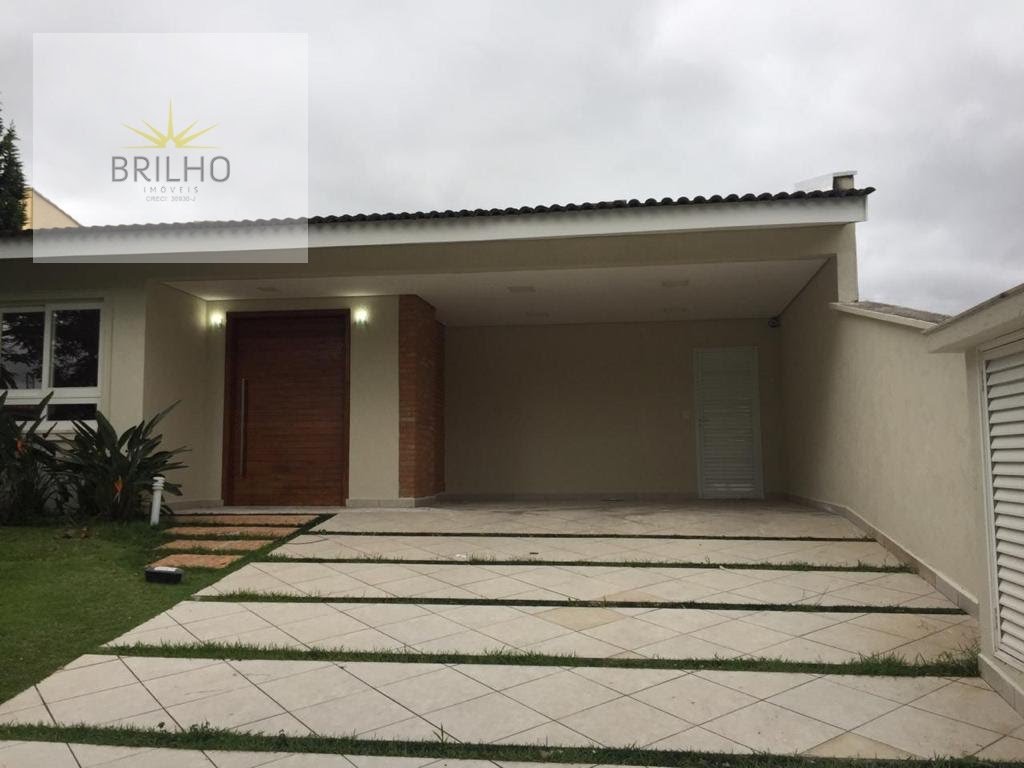 Casa térrea com três suítes, sendo a suíte master com dois closets, cozinha ampla, sala com dois ambientes e uma suíte no pavimento superior. Área ampla com fogão a lenha e churrasqueira, além de suíte lateral.