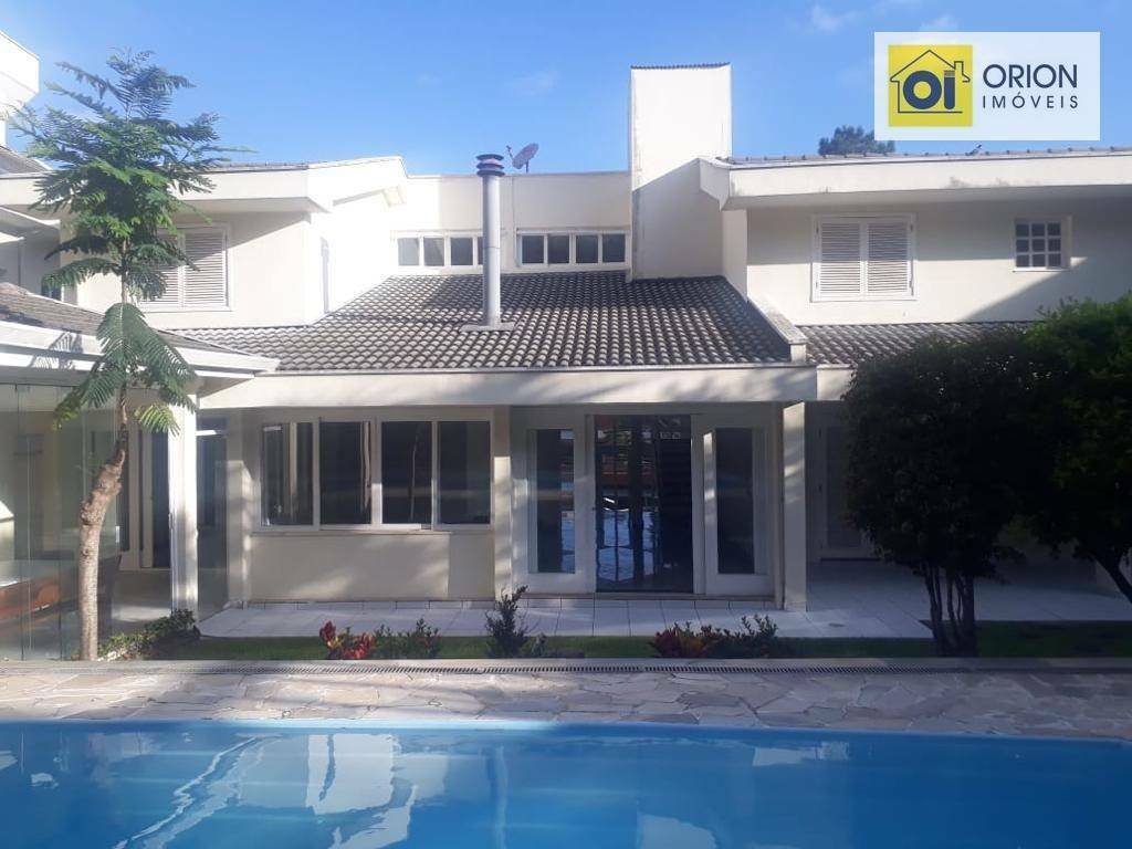 Sala para 3 ambientes com lareira central revestida em mármore Sala de almoço Cozinha Dispensa Lavabo Escritório Ampla suíte no andar térreo com acesso para o jardim externo Jardim de inverno na entrada principal Área gourmet fechada com vidros retráteis e churrasqueira Piscina de 11,5 metros de comprimento Amplo jardim com árvores frutíferas Parte superior 3 suítes com closet e armários de madeira Sala de televisão.