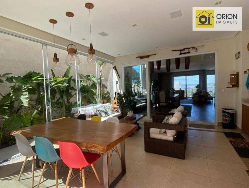 Lindo sobrado com vista permanente, com 410m² sendo 4 suítes com armários planejados, suíte máster com closet e banheira com hidro massagem. Todas as suítes com ar condicionado (quente/frio) e persianas automatizadas. Tem roupeiro junto às suítes. Sala ampla de 3 ambientes, com pé direito duplo e 2 lareiras biofluído, cozinha e lavanderia com móveis planejados. Bar e adega para vinho; escritório planejado. Área gourmet com churrasqueira e forno de pizza; piscina aquecida, banheiro; deck de madeira ao lado da piscina; redário amplo com pergolado coberto com dois pés de maracujá doce; um lindo pomar com diversas árvores frutíferas (goiaba, amora, limão siciliano, laranja, maracujá, jabuticaba, atemóia e lichia); jardim de frente decorado com palmeira azul; vagas para 4 carros, sendo 2 cobertas. Venha conhecer e fazer sua proposta.