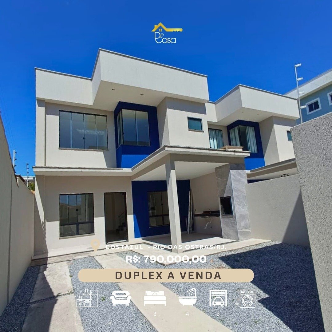 Um imóvel completo para quem busca espaço, modernidade e uma localização privilegiada em um dos bairros mais desejados de Rio das Ostras. Destaques do imóvel: 3 suítes amplas com banheiros modernos Banheiro social Sala espaçosa com 2 ambientes Cozinha ampla Área de serviço arejada Área gourmet equipada com churrasqueira e pia Garagem para até 3 veículos Localização: Costazul - Rio das Ostras/RJ Próximo à praia, gastronomia, comércio, escolas e a poucos minutos do centro da cidade e a poucos metros da praia de Costazul. Gostou? Agende sua visita e conheça de perto esse duplex exclusivo!
