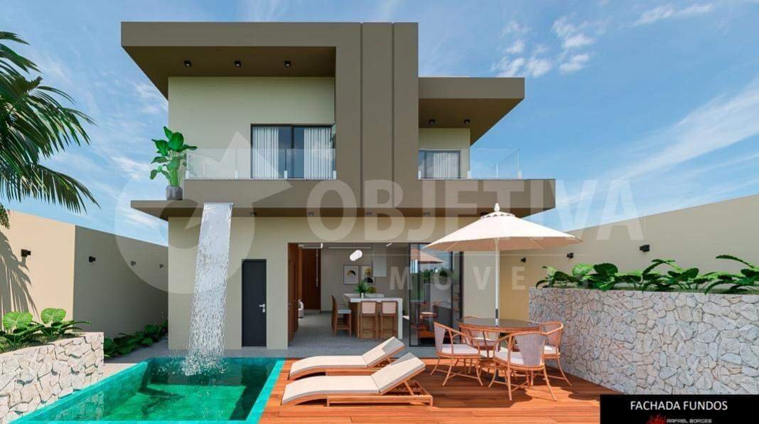 Ótima casa estilo sobrado, disponível para a venda no bairro Granja Marileusa. Condomínio Terras Alpha bem estruturado e com lazer completo. O imóvel conta com área construída de 223m² em um terreno de 300m². São 03 suítes no pavimento superior. Todas com sacada, sendo a suíte máster com closet e pia bancada dupla, e também um mezanino no mesmo andar. O primeiro piso conta com escritório separado; cozinha gourmet com ilha e churrasqueira em alvenaria; lavabo social, sala de TV e jantar integradas; área de serviço; área de lazer com piscina e cascata; garagem para 4 carros, sendo 02 cobertos. Acabamento de alto padrão: porcelanato 1,20 x 1,20; louças e metais de qualidade; boiler já instalado; preparação já instalada para energia fotovoltaica; bancadas de banheiros e escada em lâminas ultracompacta; cozinha e ilha em Preto São Gabriel escovado; portas externas em esquadrias; portas internas de qualidade; entrega com marcenaria pronta, iluminação e paisagismo. Previsão de entrega final de novembro de 2025. Aceita financiamento. Vamos te ajudar na negociação.