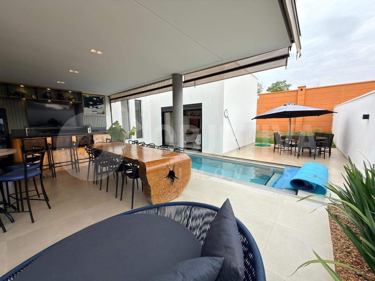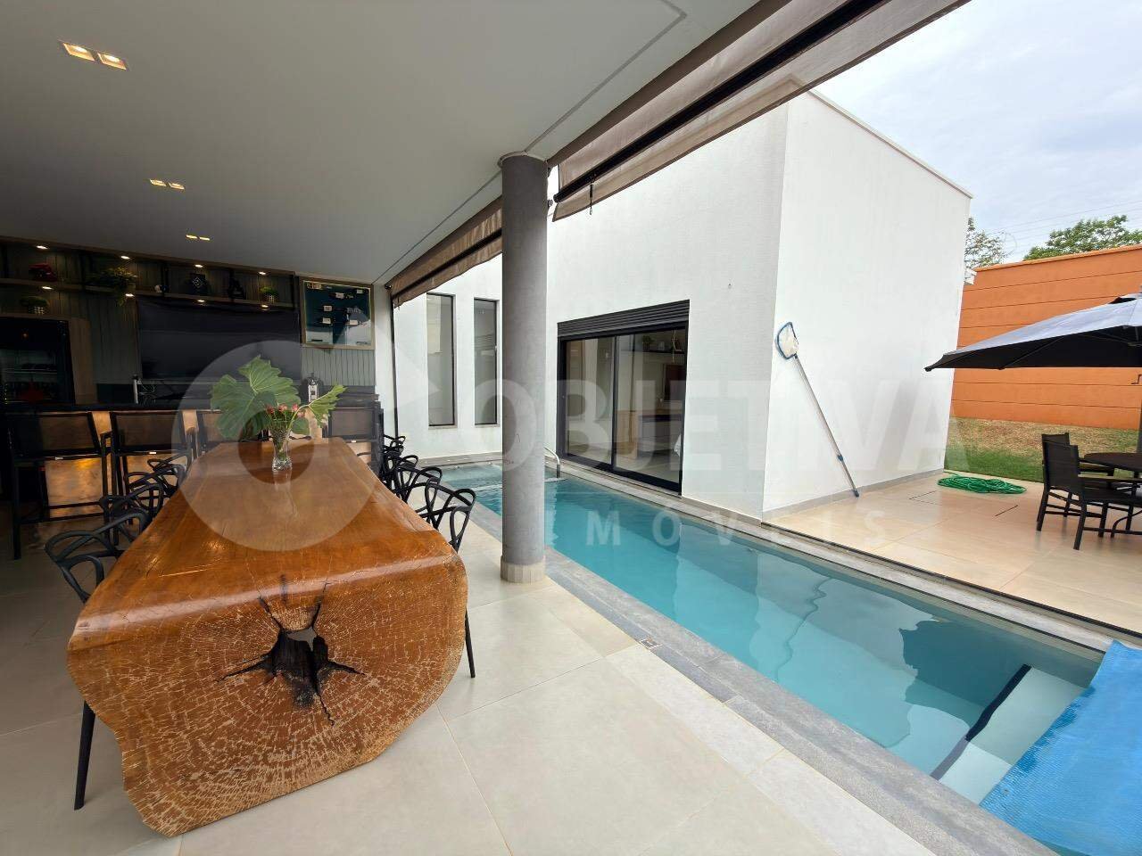 Linda casa no condomínio fechado de alto padrão Alphaville 2, na região do bairro planejado Granja Marileusa em Uberlândia. Projeto moderno com ótimo acabamento: sala em 2 ambientes, pé-direito duplo, jardim de inverno, cozinha em ilha integrada ao espaço gourmet com churrasqueira a carvão e ampla varanda com bancada, bar, piscina aquecida em alvenaria com hidromassagem, lindo piso e iluminação de chão, além de quintal e paisagismo com irrigação automática. Hall de circulação com roupeiro, 3 suítes (principal com amplo closet, banheiro com spa ofurô, janelas automatizadas e duchas de teto). Lavanderia separada. Fachada imponente, garagem para 4 carros, energia solar, boiler, aquecimento solar e sistema fotovoltaico com 18 placas. Sistema Alexia de automação, iluminação automática por comando de voz. Imóvel todo montado com móveis planejados de primeira linha, armários, espelhos, painéis, ar-condicionado nas 3 suítes e box em blindex nos banheiros. Casa recém construída, finalizando pintura nova.
