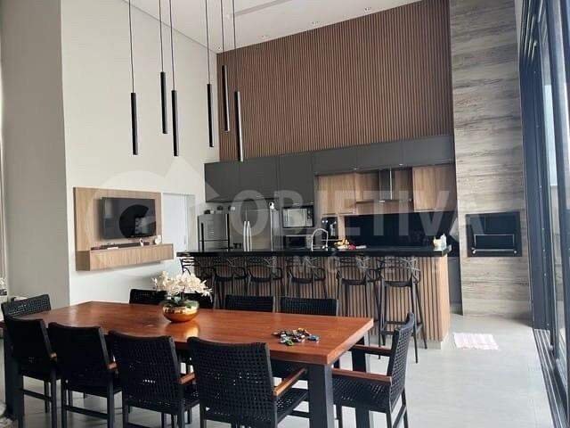 Maravilha casa térrea de alto padrão em condomínio fechado na Zona Sul da Cidade, sendo vendida de porteira fechada, com 239m² de área construída em terreno de 421m². Cozinha integrada com área gourmet revestida em porcelanato 1,20x1,20m, com pé-direito duplo de 5,50m, churrasqueira, previsão para lava-louças, geladeira com filtro. Hall para 03 quartos, todos suítes amplas, sendo uma master com closet e banheiro contendo duas cubas e duas duchas; todas elas com venezianas integradas automatizadas, e duas delas com portas com acesso ao jardim; - Todos os quartos e sala de TV com ar-condicionado instalado; Sala de TV privativa e escritório com pé-direito duplo, banheiro externo na área da piscina, área de serviço com despensa. Depósito privativo (atrás da garagem), piscina em revestimento com deck molhado, aquecimento solar e elétrico, hidromassagem e iluminação, sistema de irrigação automatizado, garagem para 04 carros, sendo duas cobertas e ponto de tomada para carregamento veicular, energia fotovoltaica para geração de energia elétrica, aquecimento solar em todos os chuveiros e torneiras da casa, portas em ACM em todos os quartos, banheiros e entrada, todos os pontos de TV e escritório com internet cabeada, fachada em mármore travertino, pele de vidro e lambri ripado amadeirado, infraestrutura para ar-condicionado em todos os ambientes, todos os ambientes com armários planejados. Condomínio com portaria 24h, fiação subterrânea, quadras de tênis, poliesportiva, de squash, de peteca, campo de futebol e Society, piscina aquecida coberta, academia, sauna, playground, quiosque, brinquedoteca, salão de festas, salão de jogos e muito mais. - Valor referente ao imóvel PORTEIRA FECHADA.