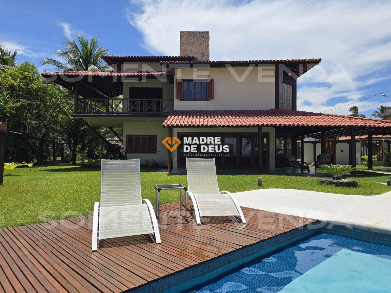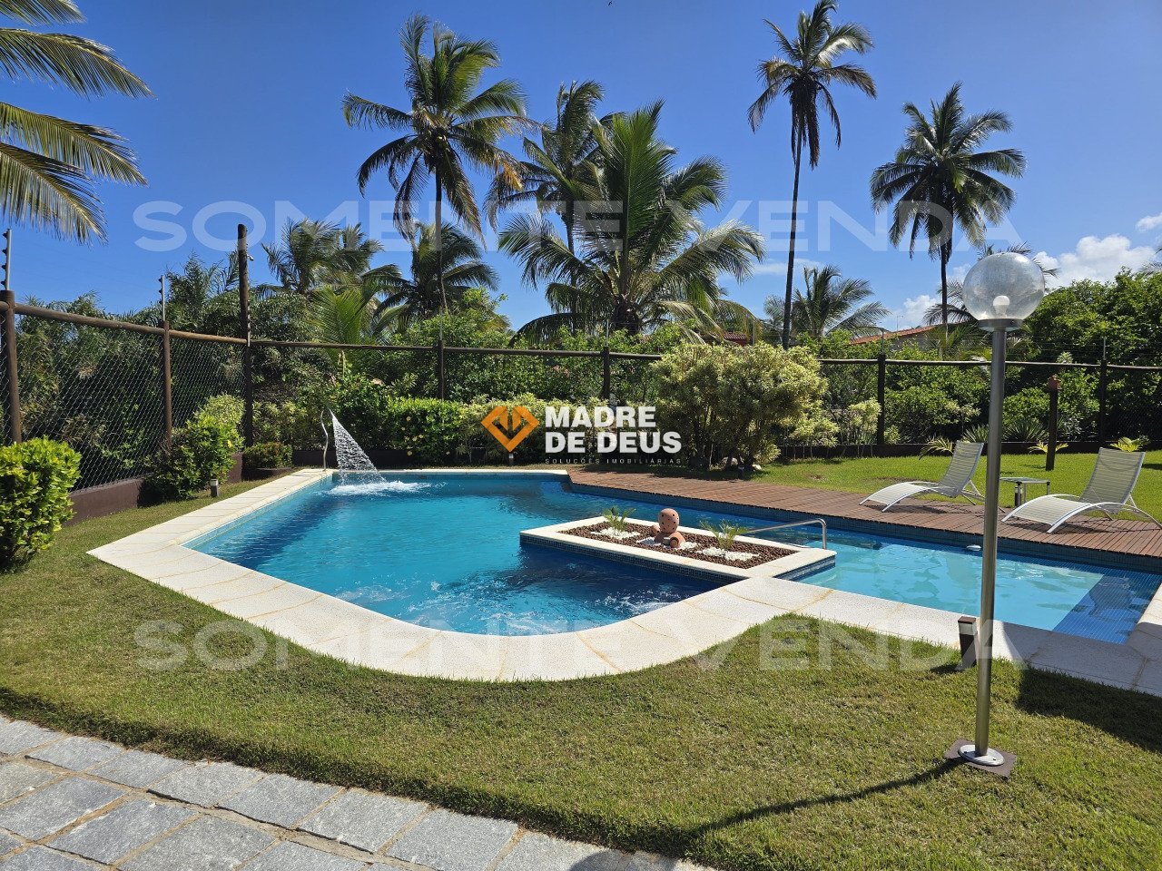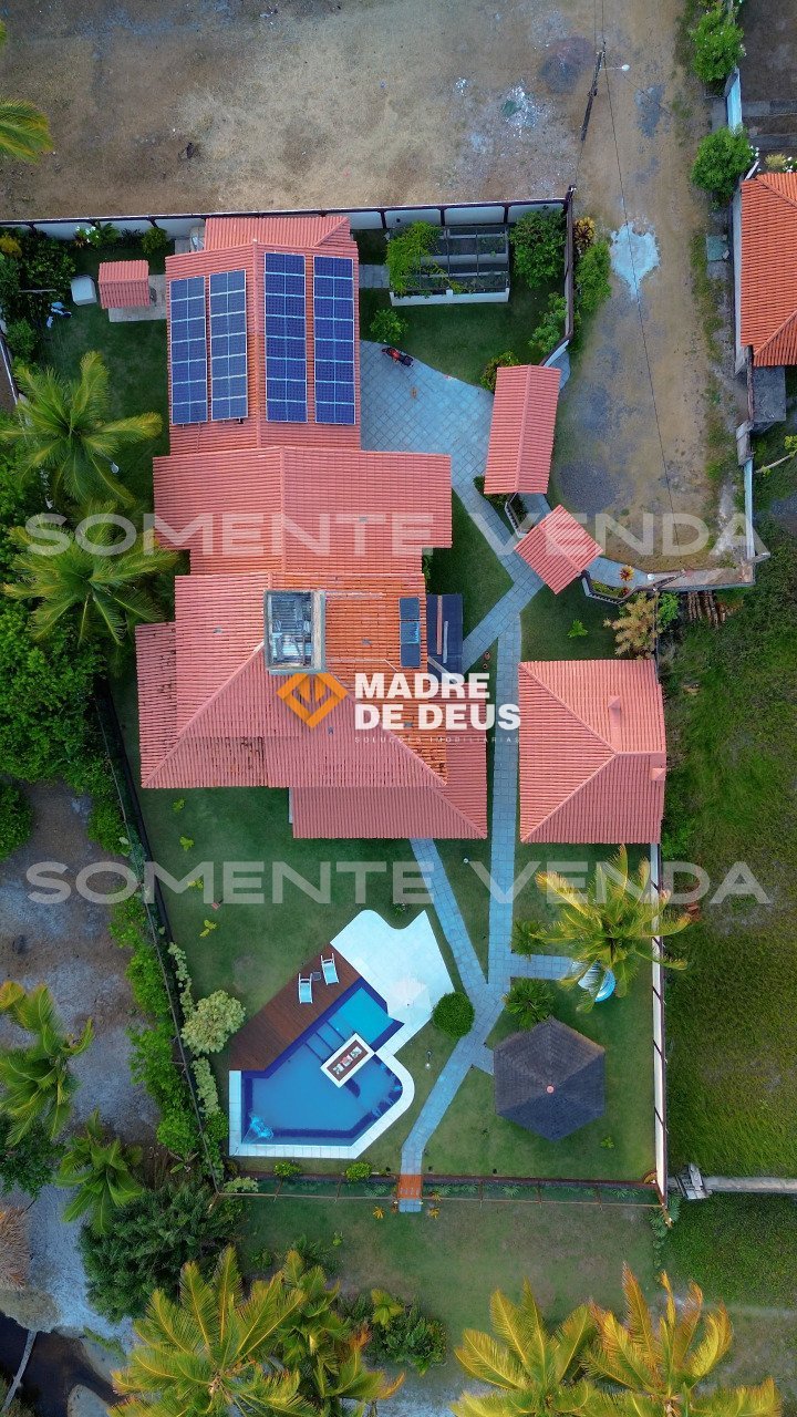 Belíssima casa à venda, em frente ao mar (pé na areia), em condomínio fechado, recém-reformada, em Ilhéus/Bahia. 1.300 m² de terreno de frente para o mar e 350 m² de área construída. 4 quartos, sendo 1 suíte master com closet, 2 suítes e escritório reversível, todos com ar condicionado split novos e repletos de armários planejados em cedro. Lavabo com 4º box de chuveiro anexo. Ampla sala de estar/jantar. Copa, cozinha e lavanderia com armários planejados. Geração própria de energia elétrica (sistema de energia solar com 33 painéis). Estação de tratamento de água, horta suspensa, garagem coberta para 4 a 6 carros. Piscina de 50 m³ com hidromassagem, cascata, prainha, deck de cumaru, borda atérmica, chuveirão e quiosque de apoio. Quiosque gourmet com churrasqueira, forno de pizza, forno e fogão a lenha. Belíssimos jardins, pergolado e gramado. Recém-reformada: novos metais e louças, porcelanato 90x90. Venda com porteira fechada.