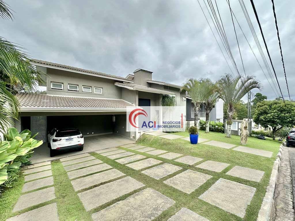 Linda casa moderna integrada, com ótimos acabamentos. Mobiliada e decorada! Jardim com paisagismo. Imóvel repleto de armários. Portas e janelas em PVC branco. Pisos em porcelanato, tacos de madeira e porcelanato rústico antiderrapante. Projeto de gesso, iluminação e som. Louças e metais diferenciados. Ar condicionado em todas as suítes, na sala, no escritório e no salão de festas gourmet de teto. Automatização na casa toda. Três entradas: social, lazer e serviço. Hall de entrada social com pé direito alto, porta pivotante imponente e fechadura eletrônica. Lavabo lindo decorado. Escada em porcelanato com guarda corpo de vidro. Hall íntimo com escritório, roupeiro e ar condicionado no piso superior. Quatro suítes com armários e bancadas, ar condicionados e painéis para TV. Sendo duas com varandas e vista e a master com dois closets planejados e espelhos. Banheiros com espelhos, gabinetes com gavetões, bancada, box de vidro até o teto, nichos e chuveiros de teto. Sendo a master com tampo em mármore, duas cubas, duas duchas de teto e dois vasos separados. Living para cinco ambientes voltados para varanda, piscina, jardim e anexo gourmet. Jantar com cozinha integrada, estar, home theater planejado revestido com lambril e bar. Adega climatizada e porta de vidro. Cozinha integrada ao living com um grande e confortável balcão, em ilha, ideal para almoço, café e aperitivo. Fogão 5 bocas com coifa, bancada em L, com duas cubas inox. Forno, micro-ondas, máquina de lavar, tudo de ótima qualidade e grande despensa. Varanda envidraçada com estrutura metálica, praça do fogo à gás e vista. Piscina de alvenaria, aquecida solar, hidro SPA para 10 pessoas, prainha, cascata e solarium, com piso atérmico anti-derrapante. Banheira de hidro massagem para 7 lugares. Anexo gourmet/salão de festas multiuso envidraçado com grandes portas de correr. Ideal para festas, jogos, academia e música, com ar condicionado de teto, projetor, churrasqueira em inox e vidro, coifa inox, bancada em L com pia inox
