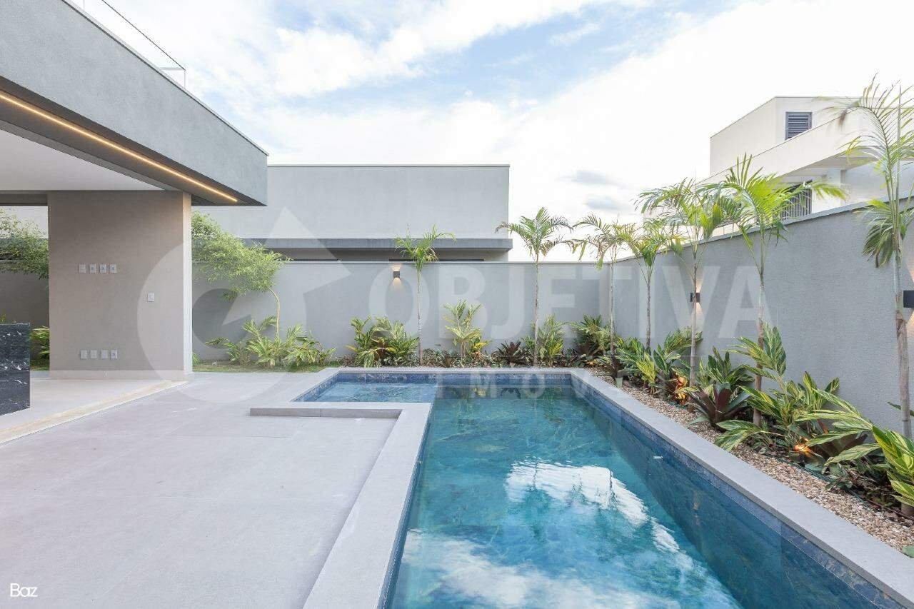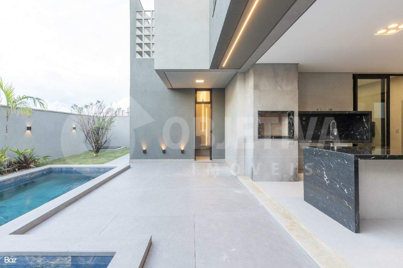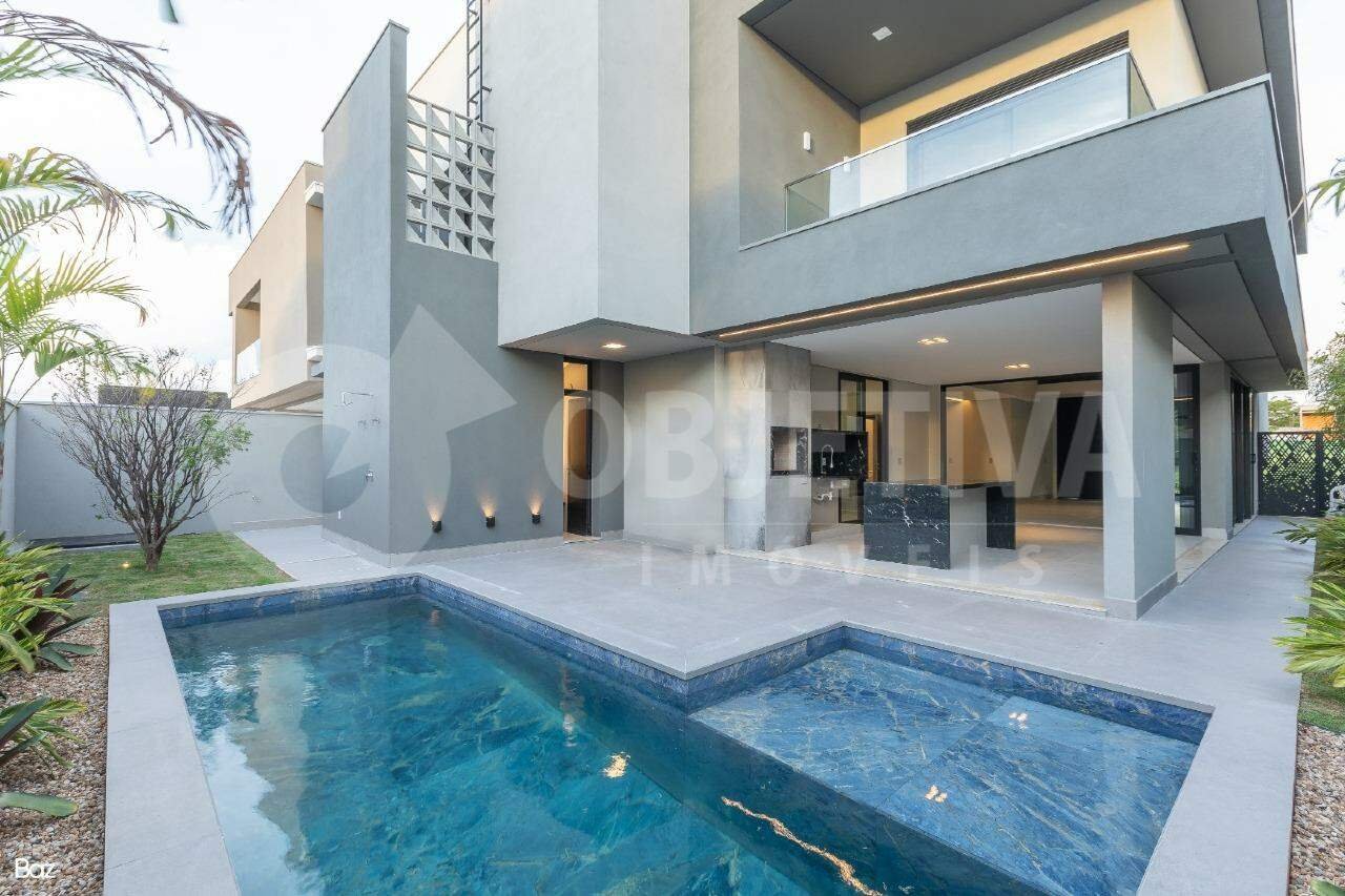 Magnífica casa estilo sobrado de altíssimo padrão no condomínio com projeto moderno, acabamento de altíssima qualidade. São 336,36m² de área construída em um terreno de 420m² total, dispondo de hall de entrada, sala de estar e jantar, home TV, lavabo, cozinha, depósito, lavanderia, garagem coberta para 2 carros e mais 2 descobertos, varanda gourmet com churrasqueira, piscina com prainha, vestiário e lavabo. No piso superior, consta uma área íntima contendo 03 quartos, todos suítes, sendo a principal uma suíte máster com closet. A casa possui aquecimento solar com boiler, energia fotovoltaica já instalada e irrigação automatizada no jardim. O condomínio oferece um lindo salão de festas, academia completa, piscina aquecida, quiosque com churrasqueira e forno de pizza, playground, quadras de tênis e poliesportivas, 02 quadras de beach tennis, quiosque e 03 playgrounds.