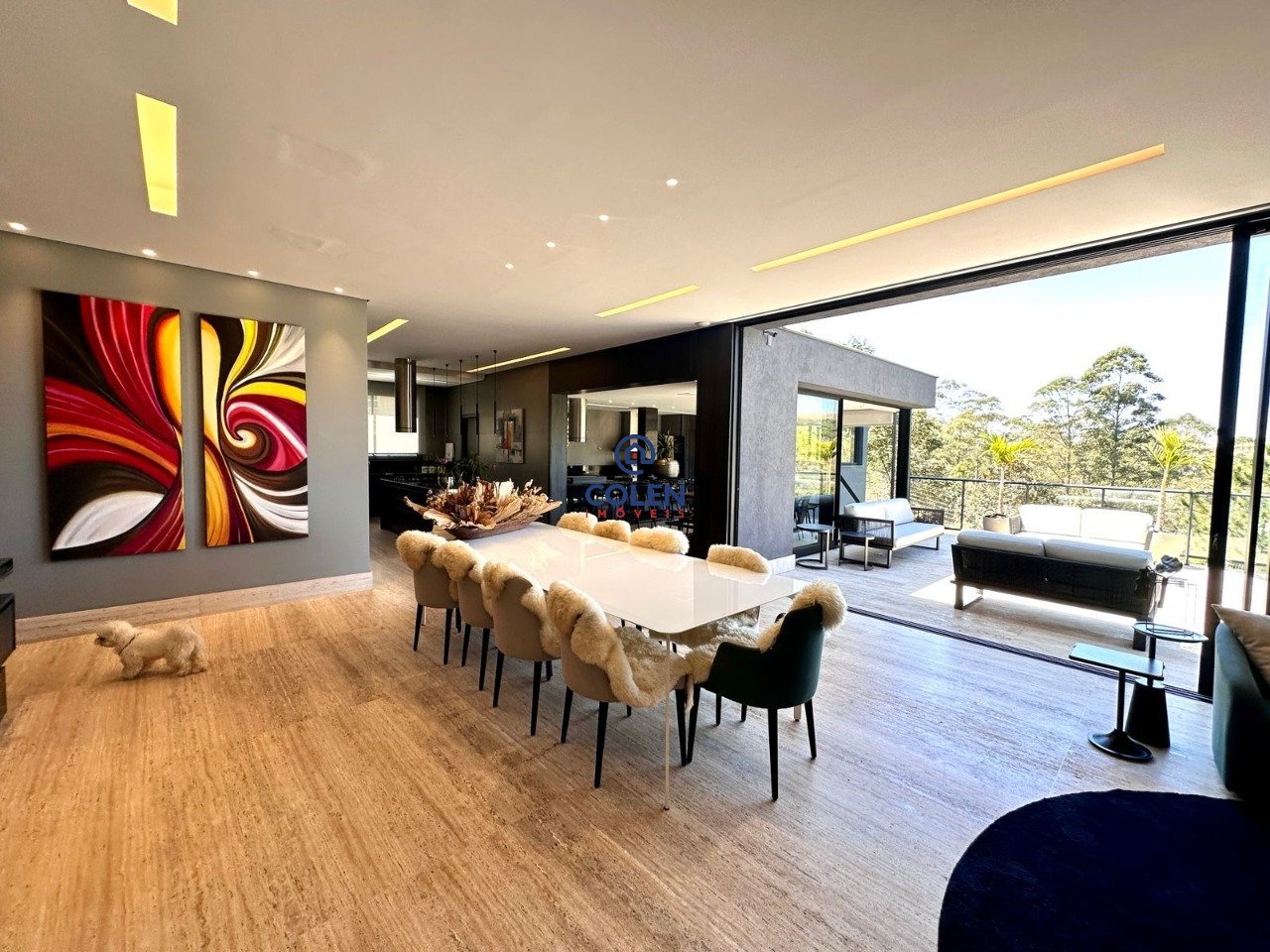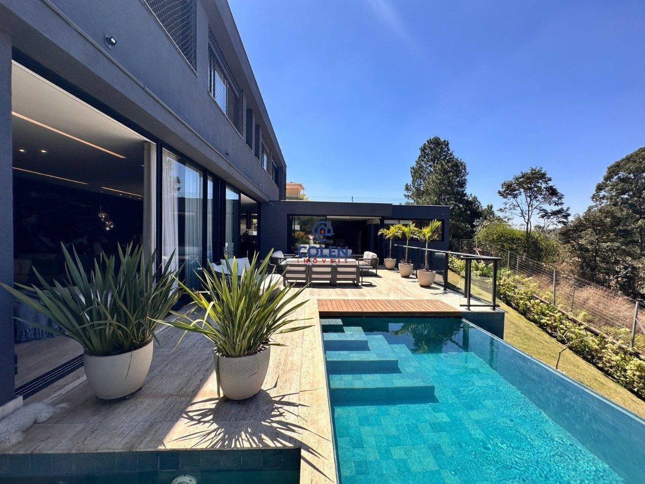 Mansão de Luxo no Condomínio Árvores | Alphaville Lagoa dos Ingleses. Casa com 5 suítes e área de lazer completa em Alphaville Lagoa dos Ingleses, Nova Lima/MG. São 540m² de área construída em um terreno de 1235,06m², 4 suítes e área de lazer completa. Destaques do Projeto: Fachada moderna e imponente com espelho d'água que integra a piscina. Iluminação natural abundante, vista definitiva para as montanhas, acabamentos nobres e marcenaria planejada. Sala ampla com ambientes conjugados e todo o piso da casa no travertino. Os detalhes da marcenaria da sala contam com painel ripado em madeira e granito preto, lavabo maravilhoso no granito. Cozinha integrada com ilha central e bancada em granito. Ainda no primeiro pavimento, temos uma suíte espaçosa com janelas amplas. 4 suítes climatizadas no andar superior com piso em madeira natural, janelas automatizadas. Suíte master espaçosa, e banheiro com banheira e bancada dupla. Piscina com borda infinita e aquecida. Espaço gourmet com churrasqueira, cervejeira, adega e armários. Jardim com paisagismo completo, pomar com diversas espécies de frutas com irrigação automatizada. A casa possui um espaço multiuso que hoje funciona como academia e campo de futebol. Casa de máquinas ampla. Garagem coberta para 4 carros com ponto para carro elétrico. Aquecimento solar e usina fotovoltaica. Esquadrias em alumínio com persianas automatizadas.