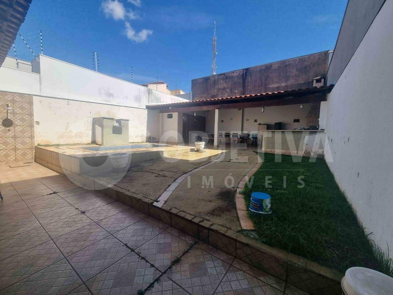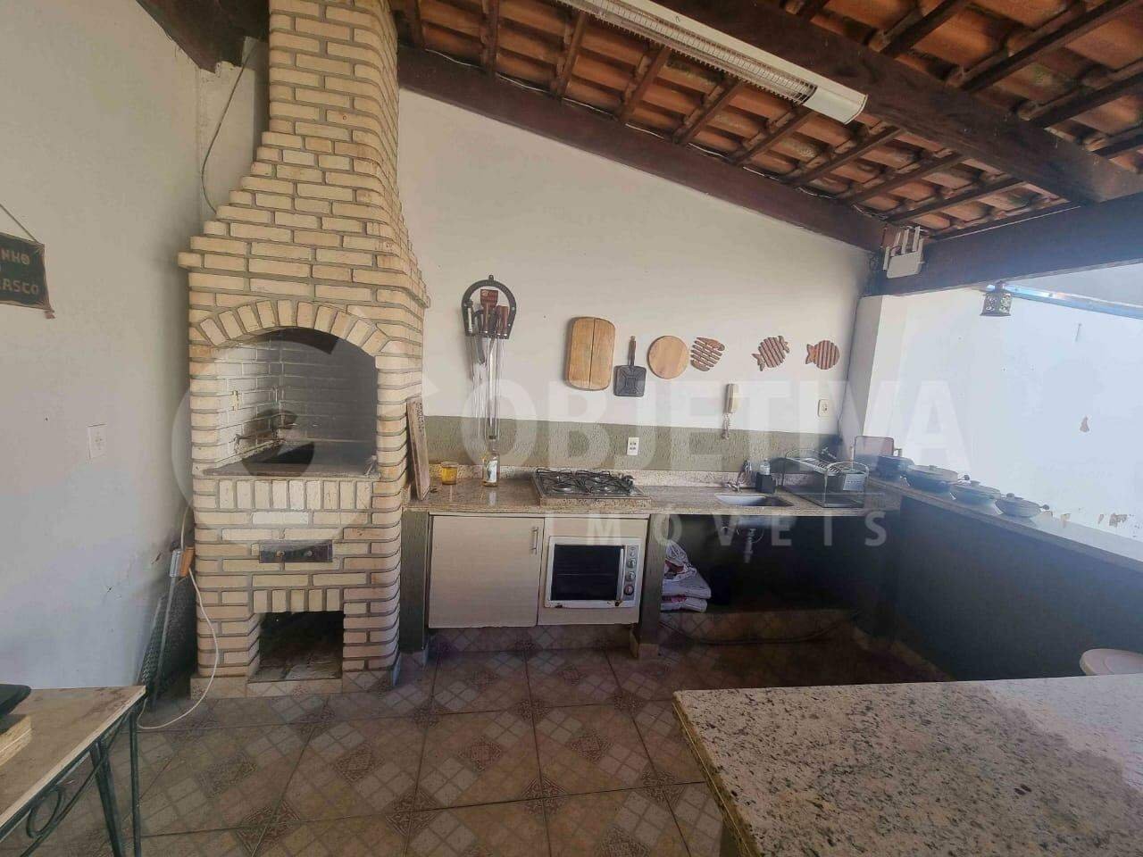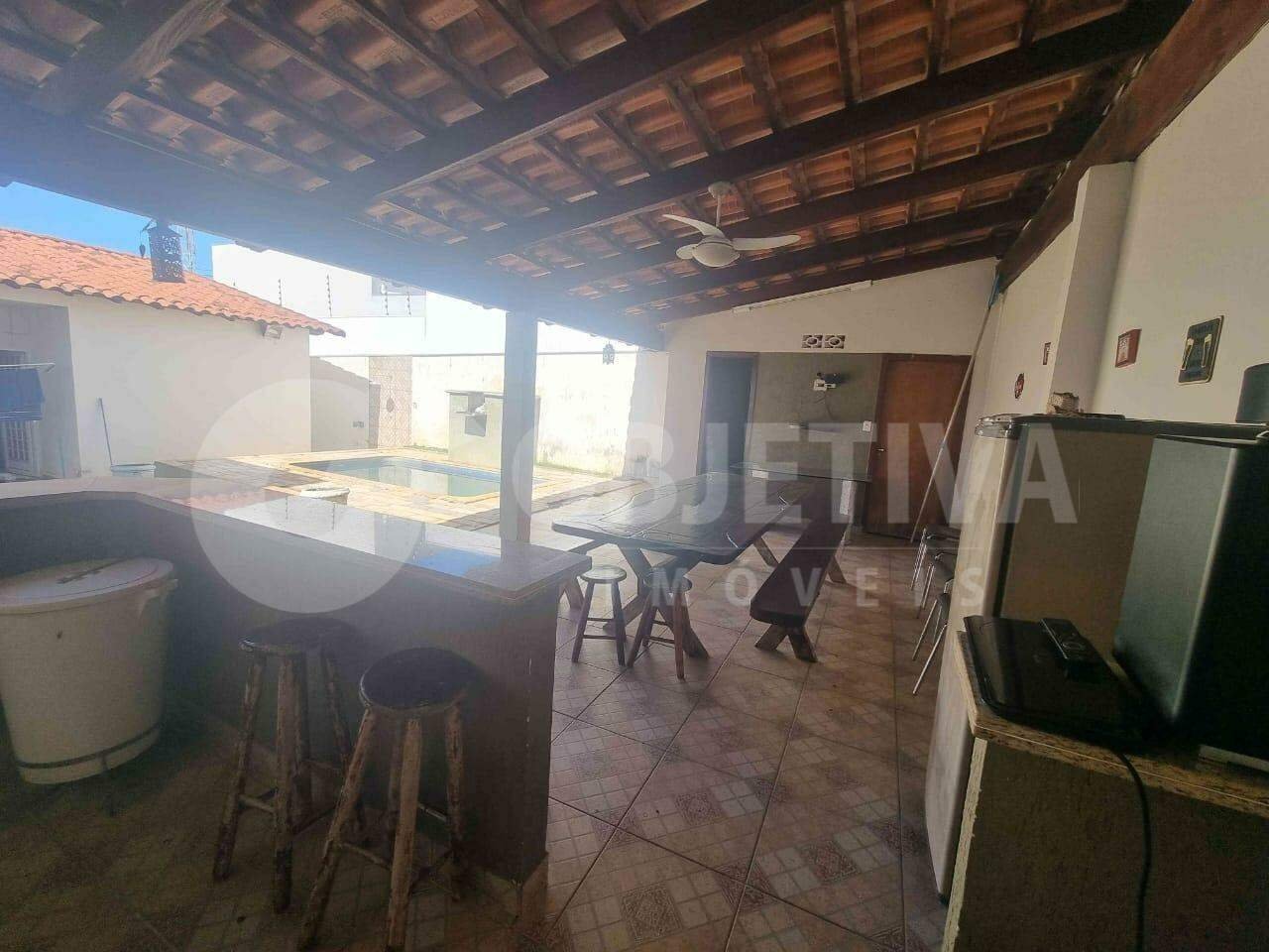 Casa para aluguel no bairro Alto Umuarama, em Uberlândia, com 140m² de área construída, composta por três quartos com armários, sendo um suíte com box em vidro, sala com painel, cozinha com armários, banheiro social também com box em vidro, área de serviço, piscina, espaço gourmet com churrasqueira, lavabo, despensa e garagem para dois carros.