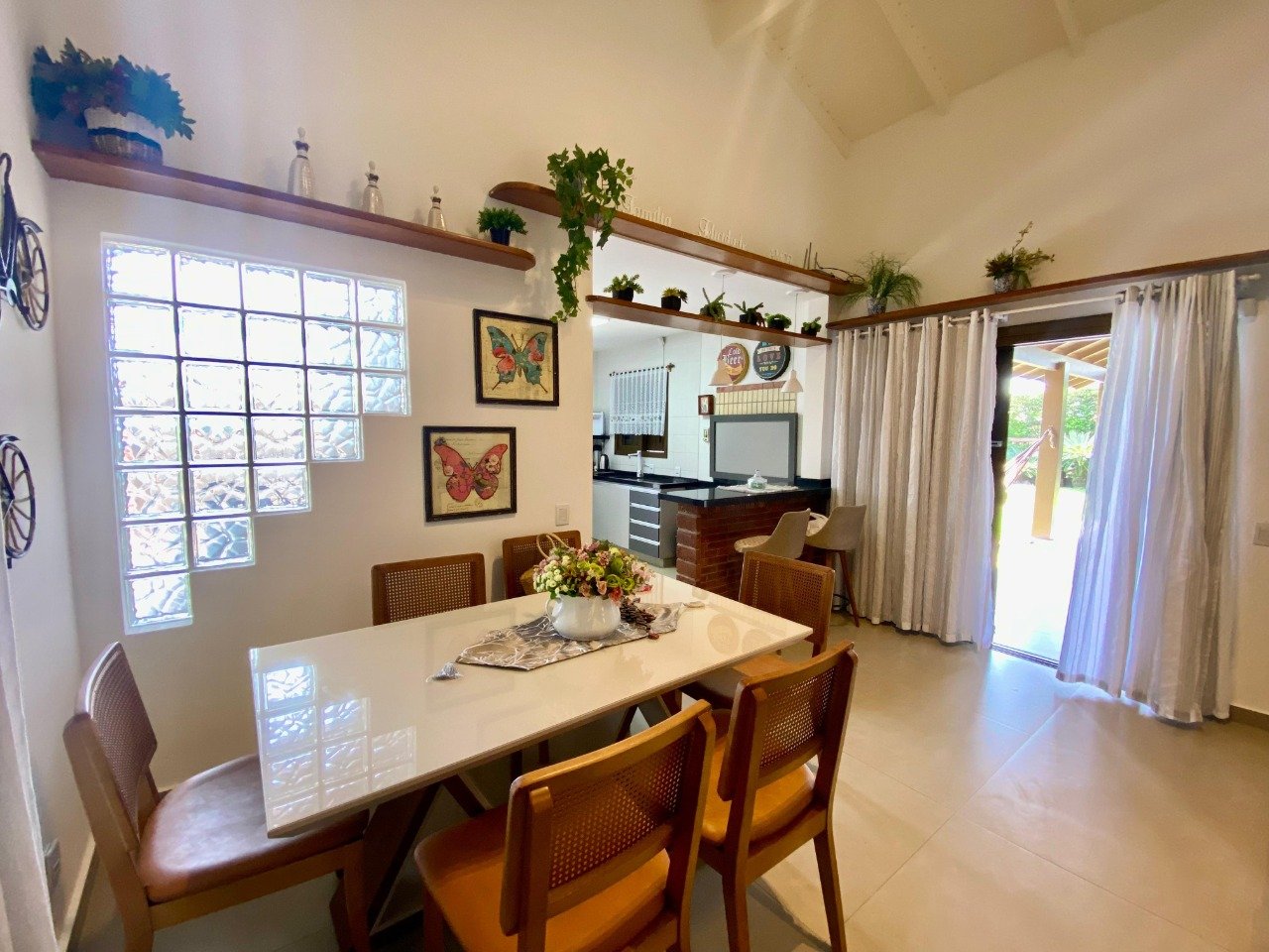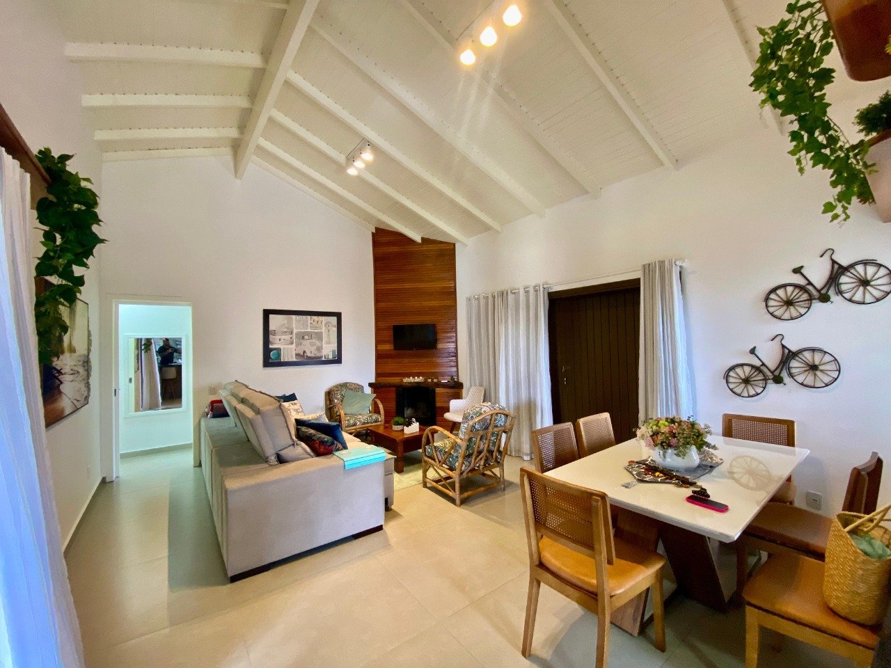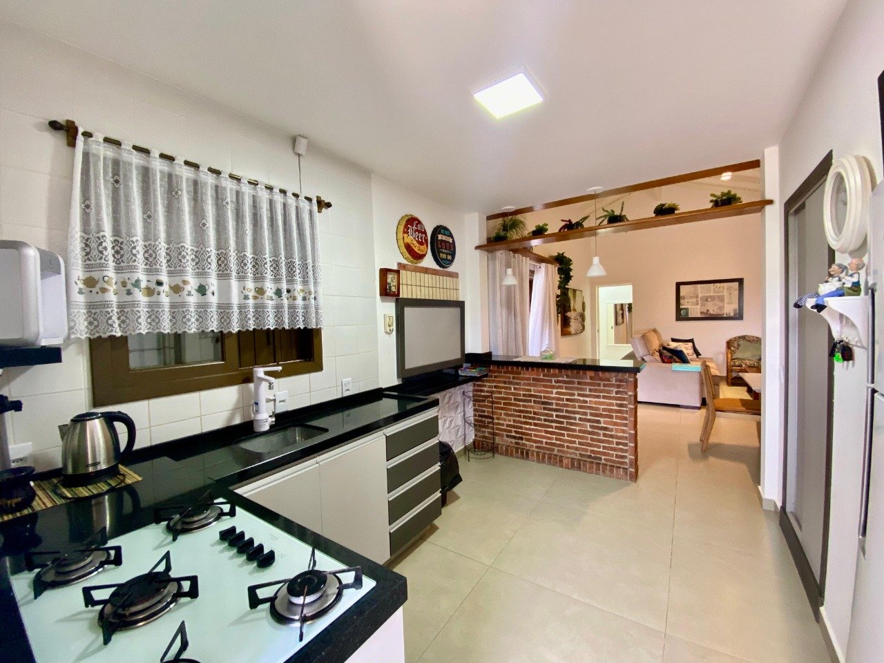 Magnífica casa nova de 3 dormitórios, sendo 2 suítes, televisão nos dormitórios, ventiladores de teto em todos os dormitórios, mobiliada e decorada, churrasqueira, cozinha completa com todos os itens, máquina de lavar roupas, possui anexo nos fundos com 1 cama de solteiro e base auxiliar, televisão e banheiro.