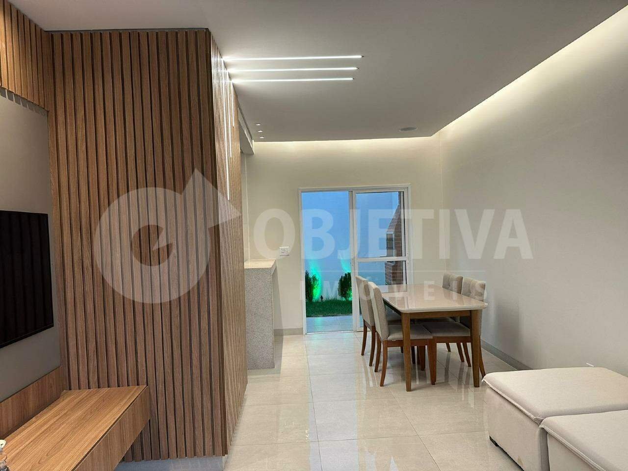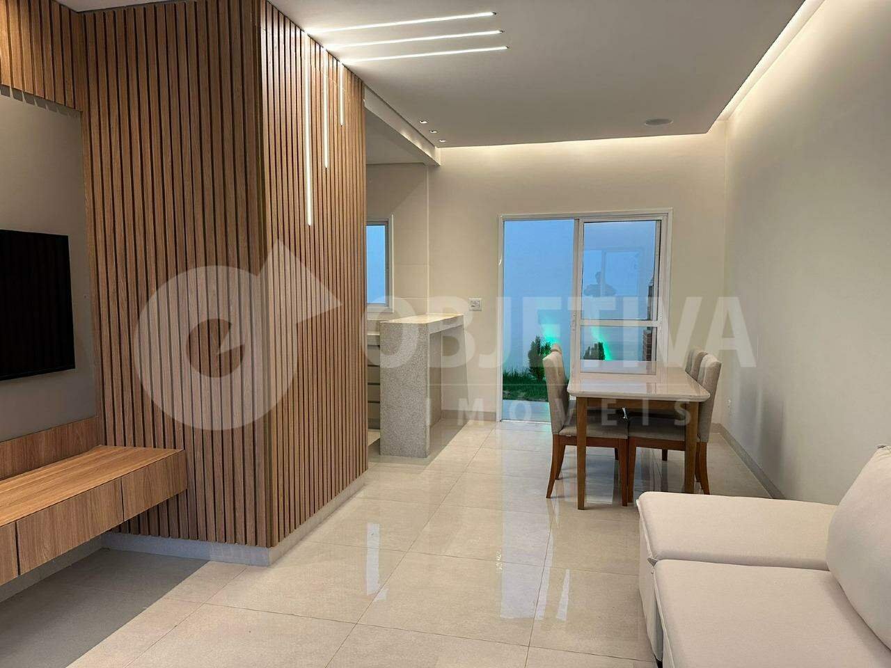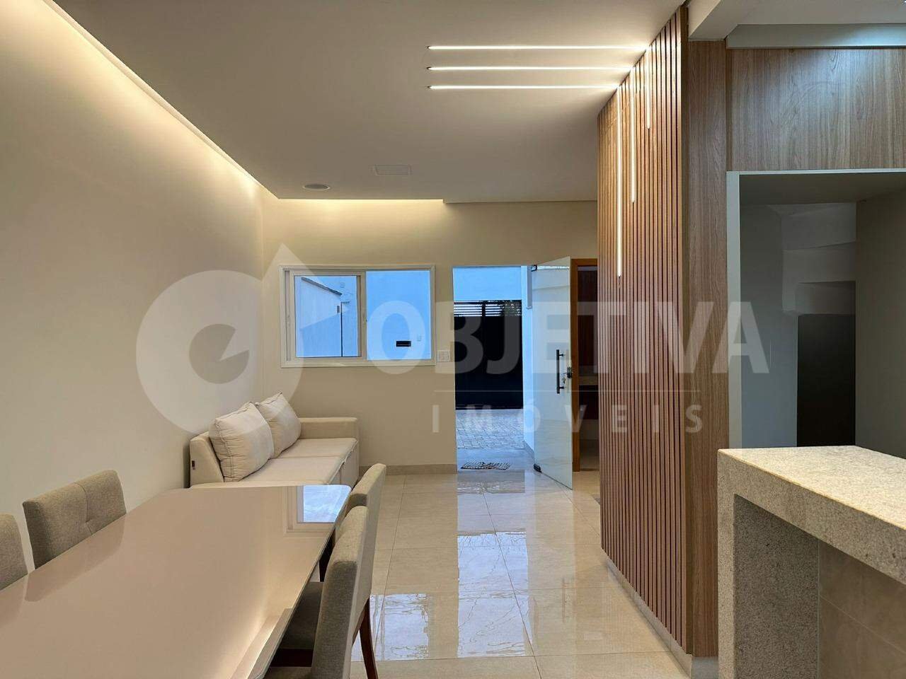 Casa tipo sobrado com 83,41 metros quadrados de área construída, com 2 suítes sendo 1 com sacada, área prevista para armário embutido nas 2 suítes, lavabo, sala de estar, sala de jantar, cozinha americana, área gourmet com churrasqueira, vaga para 2 carros, área gramada aos fundos. Acabamento com rodapé embutido.