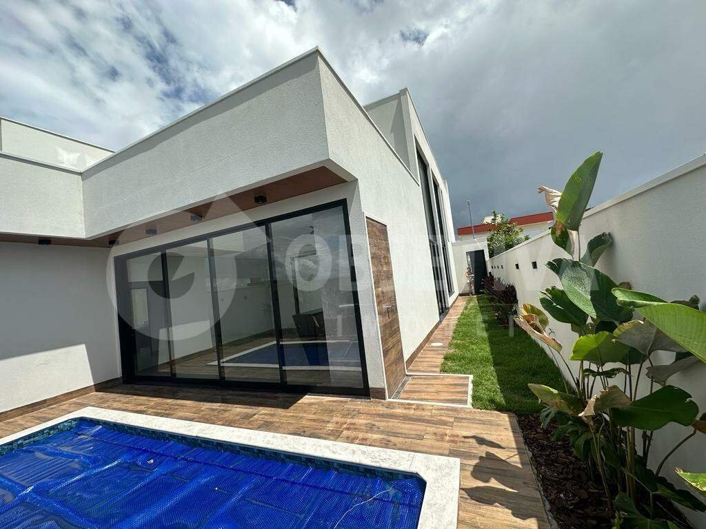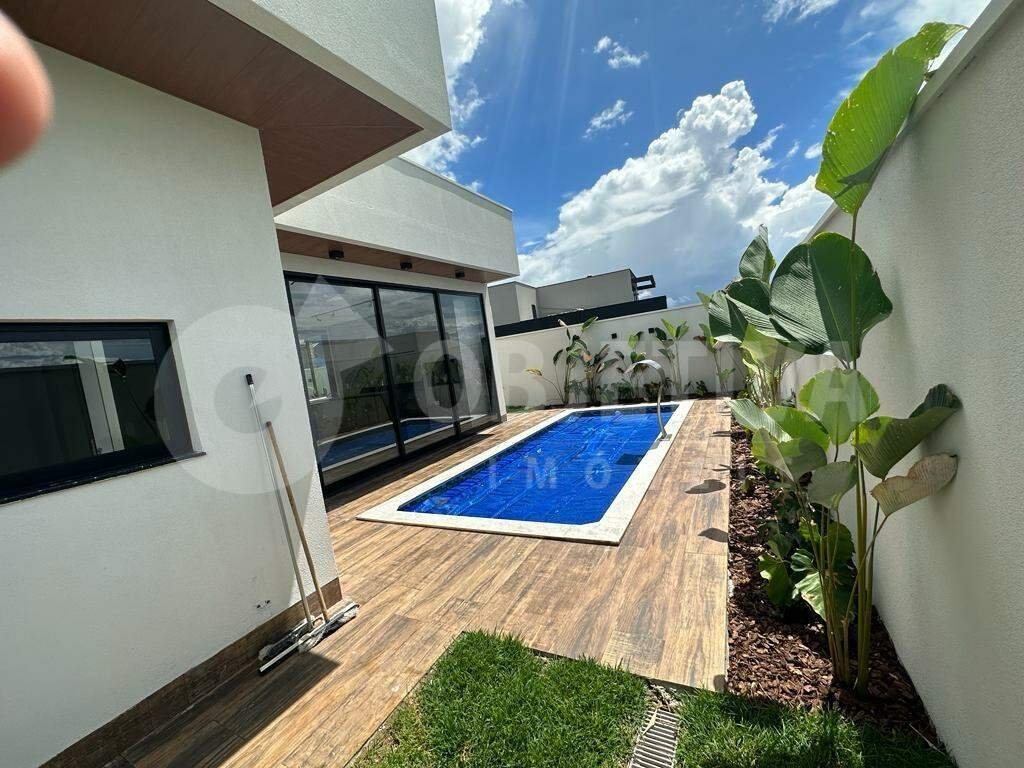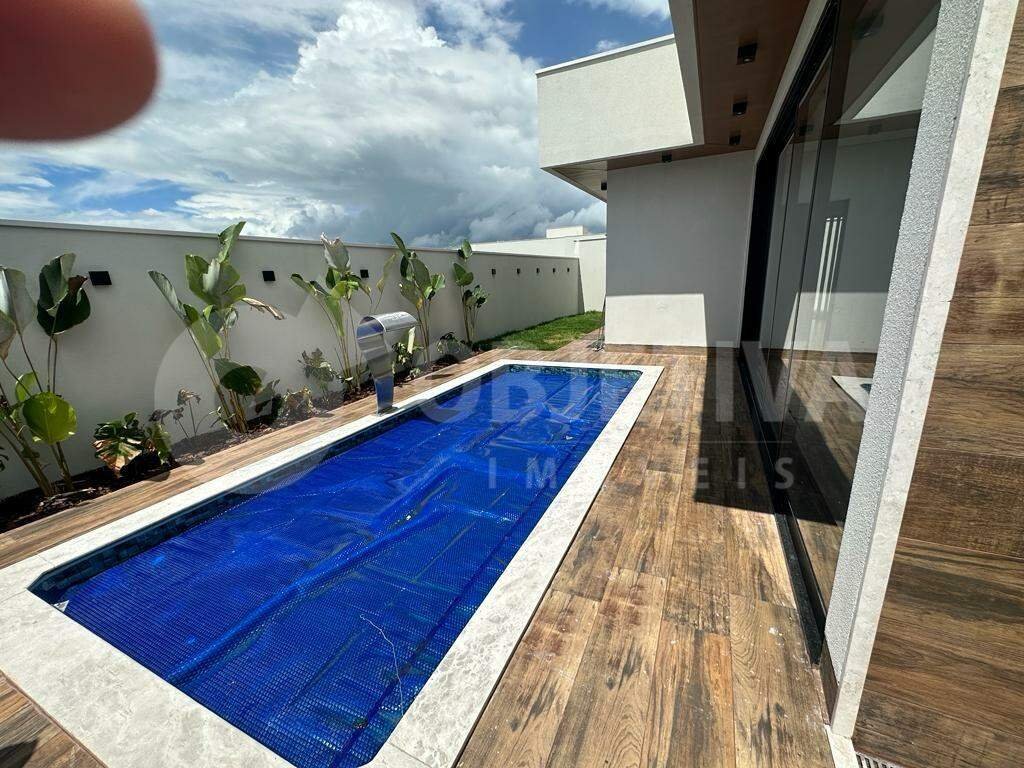 Maravilhosa casa nova em estilo sobrado à venda no condomínio, região do bairro planejado, setor nobre de Uberlândia. Possui fino acabamento, construção moderna e bem executada, com 300 metros de área construída, 4 quartos, 2 suítes sendo 1 master com closet e banheira de hidromassagem, sacada, banheiro social na área externa, lavabo social na sala, sala ampla com pé direito duplo, muita iluminação natural e ventilação, área gourmet com churrasqueira, piscina aquecida e todas as torneiras são aquecidas. 2 vagas de garagem (cobertas) e mais 2 carros descobertos. Linda fachada imponente. Jardim e paisagismo.