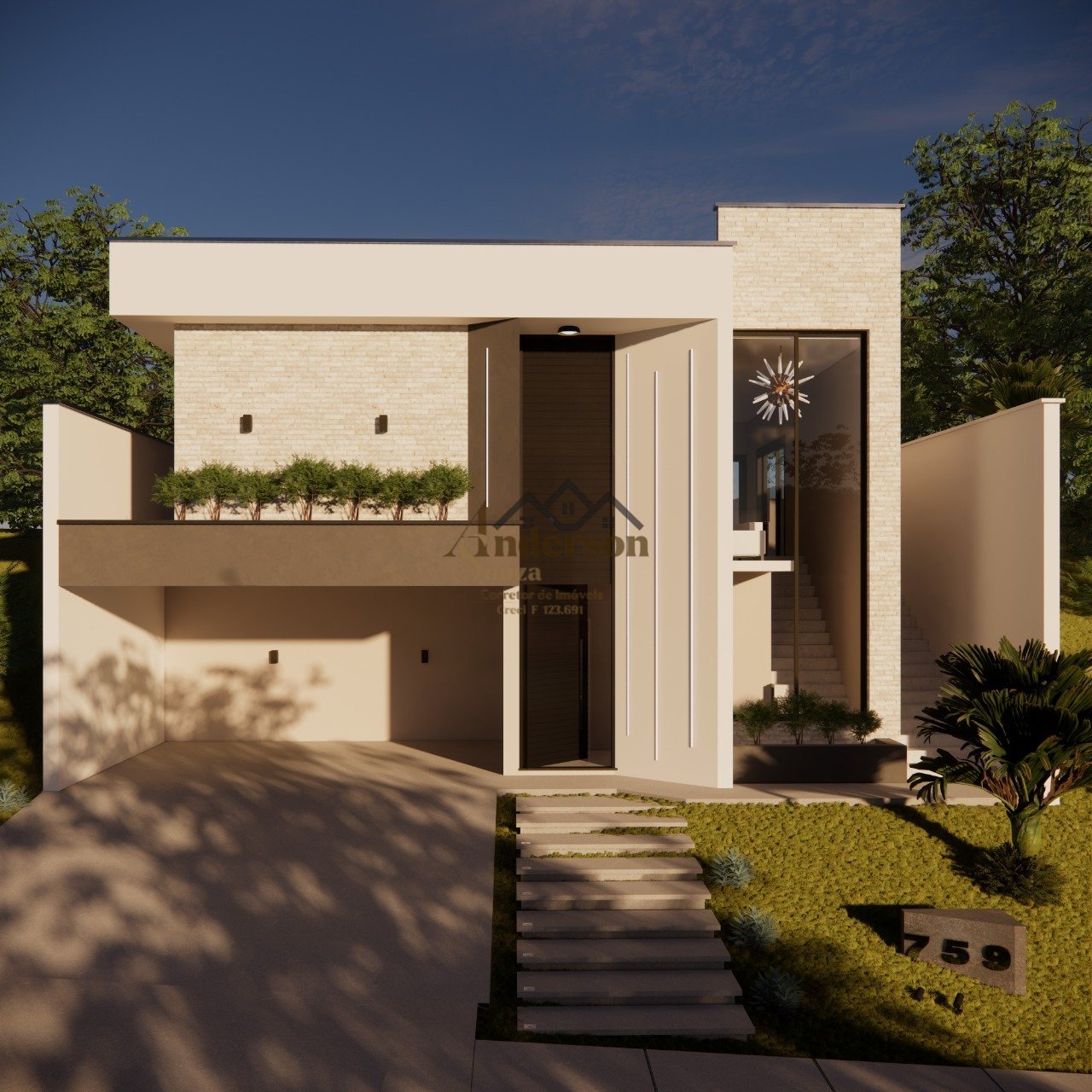 Área Terreno: 323,84 m2 Área Construída: 215,06 m2 Previsão de Entrega: maio/2026 Programa Arquitetônico: Sala Estar, Sala TV, Cozinha, Área de Serviço, Lavabo, Área Gourmet, Banheiro Externo, Escritório, 3 suítes sendo 1 master.