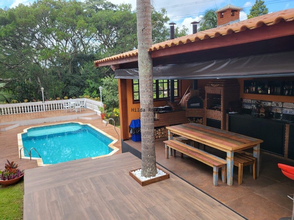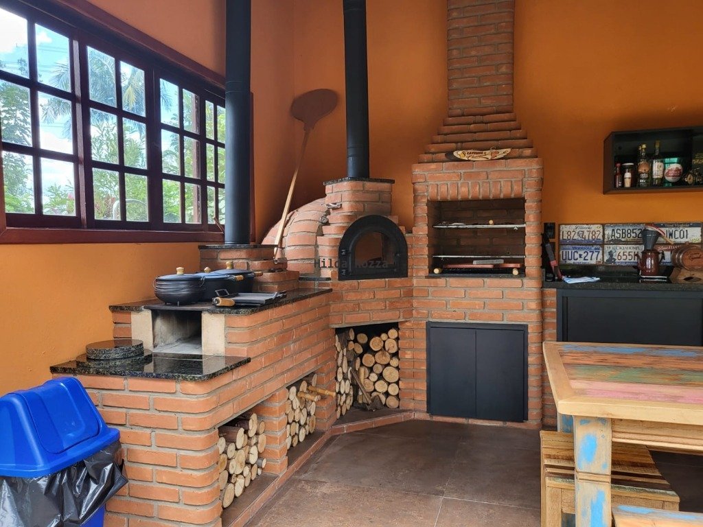 A casa tem: 3 quartos, cozinha, lavanderia, 2 banheiros, área gourmet externa com cozinha mineira (forno e fogão a lenha), churrasqueira, fogão de indução, WC, geladeira, TV 55", mesas e bancos rústicos, pergolado externo com lareira, piscina com aquecedor solar, pomar, jardim gramado, garagem, sala de estar com dois ambientes, contendo dois jogos de sofá (um deles é do tipo chaise), TV 65" 4K e lareira, área de inverno envidraçada com mesa e cadeiras rústicas, jogo de sofá e poltronas em ratan. Toda mobiliada.