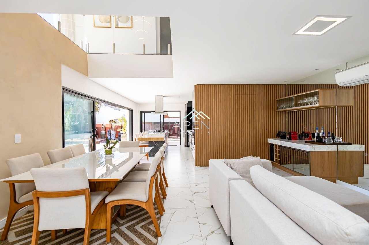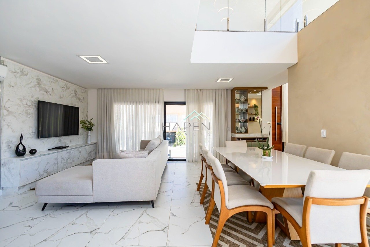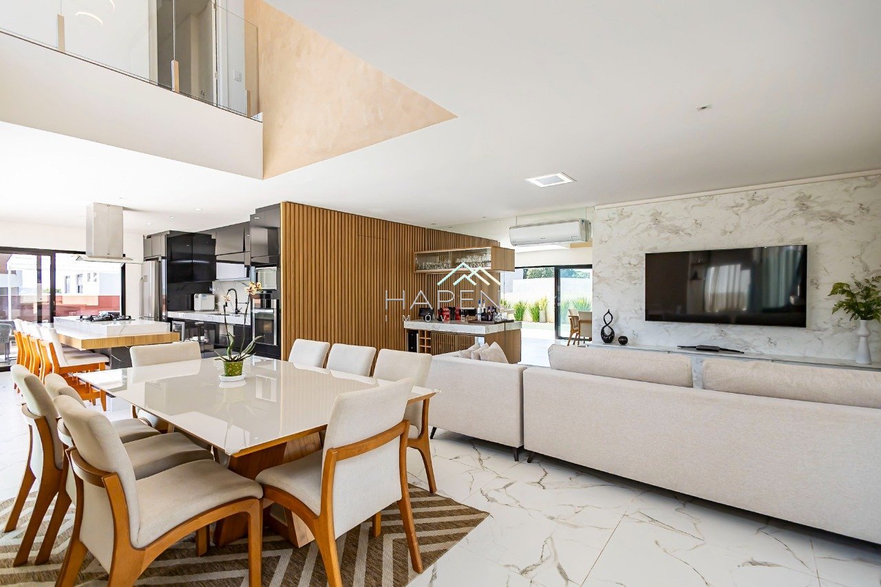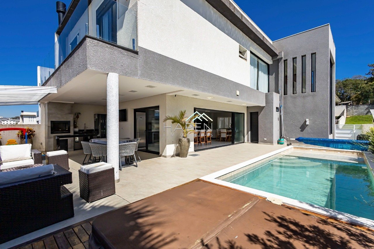 Imagine viver em uma casa linda de alto padrão, não geminada, face norte em todos os ambientes internos, projetada para oferecer bem-estar, funcionalidade e muito estilo. Em um terreno de 300m², com 320m² de área privativa construída, este imóvel surpreende desde a fachada até cada detalhe interno. O grande diferencial está na piscina aquecida integrada a um SPA privativo, criando um cenário perfeito para momentos de lazer e descontração em família ou entre amigos. A área social foi pensada para encantar: ambientes modernos e integrados, espaço gourmet com churrasqueira a carvão, lareira ecológica e um elegante projeto de iluminação, tudo cercado por paisagismo que valoriza ainda mais a atmosfera acolhedora. O condomínio conta com apenas 40 residências de alto padrão, portaria, sistema de monitoramento e segurança especializada, além de áreas de lazer para toda a família. Distribuição dos Ambientes TÉRREO - Living com pé-direito duplo - Escada com parapeito em vidro - Cristaleira embutida - Sala de jantar e estar com painel de TV e bar - Lavabo sofisticado com mármore - Cozinha em ilha com móveis planejados de alto padrão - Integração total com área externa e piscina aquecida - Lounge com SPA e espaço gourmet completo - Lareira e lareira ecológica PISO SUPERIOR Um lindo Mezanino cercado por janelões que trazem muita luminosidade. - Suíte master com sacada, closet e banheiro com cubas duplas, chuveiros duplos e toalheiro térmico - Suíte 2 com varanda, móveis planejados e banheiro moderno - Suíte 3 com escritório integrado, painel de TV e sacada - Corredor com jardim de inverno envidraçado SUBSOLO - Depósito, armários planejados e garagem para até 4 veículos (2 cobertos) Detalhes Especiais - Placas solares - Captação de água da chuva - Sistema de automação residencial - Construída há apenas 4 anos - Projeto de iluminação interno e externo - Porta de entrada em madeira imponente e paisagismo exclusivo Lazer no Condomínio - Salão de festas - Playground - Quadra poliesportiva - Pergolado central