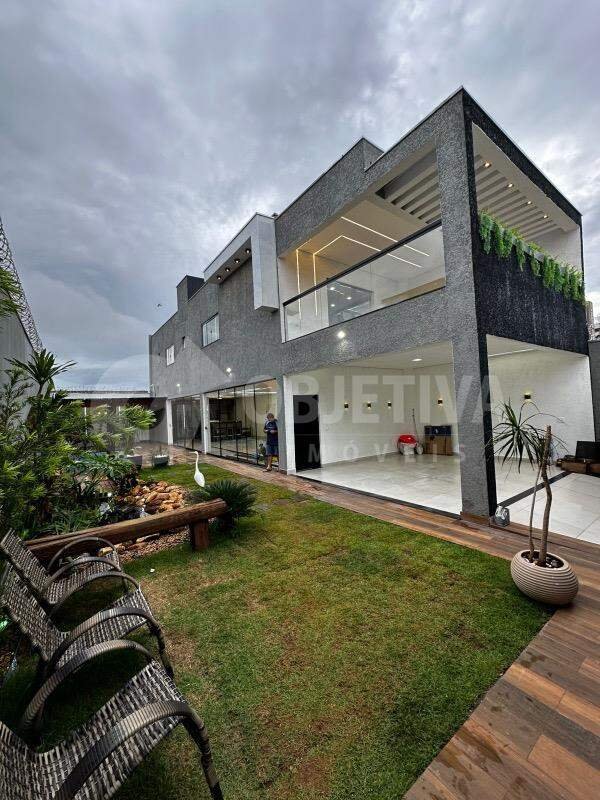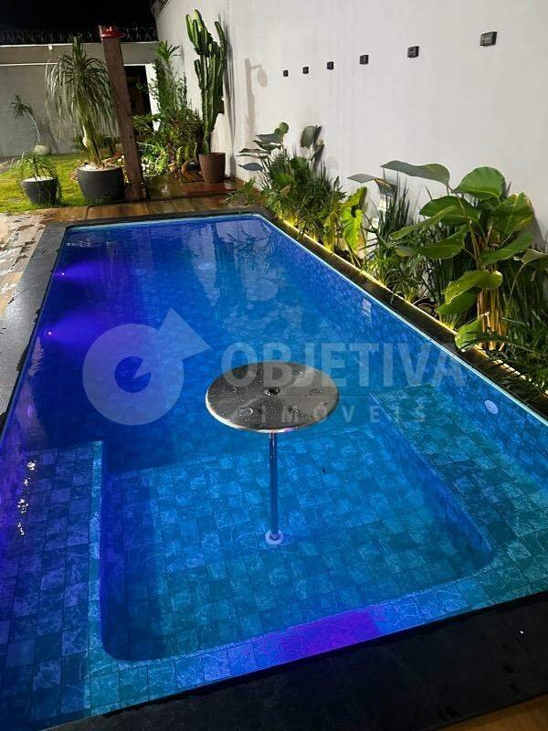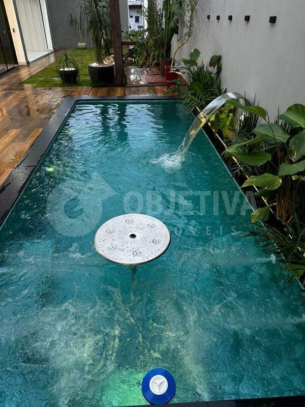 OPORTUNIDADE. Exclusivo imóvel em 2 pavimentos à venda na região sul de Uberlândia. Belíssima casa luxuosa com 260m² de construção em terreno de 250m². Sala em dois ambientes, conceito moderno em ambientes abertos e integrados, 03 suítes amplas sendo 1 master com closet e uma com preparação para hidro. Cozinha planejada com armários, espaço gourmet com churrasqueira a carvão revestida com lindo porcelanato, bancada em ilha. Banheiro social, piscina aquecida com cascata e mesa com banco (prainha), pergolado, lago artificial, deck, paisagismo, iluminação em LED, sacada ampla, sistema de câmeras e alarme, jardim decorado, área da piscina toda em porcelanato. Garagem para 02 carros. Venha conhecer e se encantar com essa linda casa. Imóvel repleto de móveis planejados de primeira qualidade, linda fachada imponente, iluminação especial, acabamento impecável.