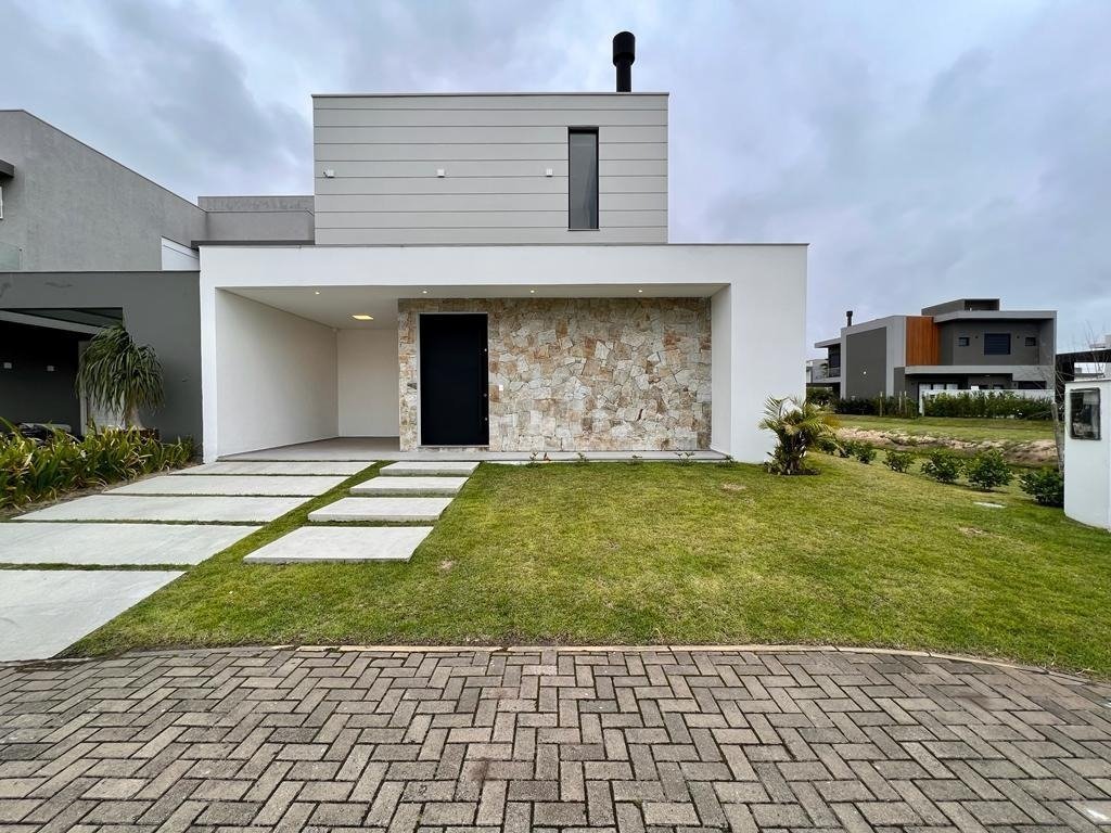 Lindíssima casa térrea, composta por 04 suítes, living em 02 ambientes com sala de estar, área social com lareira, sala de jantar, cozinha integrada, com ilha e churrasqueira, lavabo, 06 banheiros, banho social, jardim, vaga para 01 veículo. Área de serviço com banheiro e despensa. Privilegiada pela localização e posição solar, a fachada norte é contemplada com uma ótima iluminação, ventilação e vista para o lago. Área social voltada para o exterior por meio de uma única e ampla esquadria. Seus diferenciais são: esquadrias com persianas motorizadas, esquadria principal no térreo com 12,5 m. Paredes revestidas em pedra Miracema, pisante da escada em madeira, porcelanato classe A, espera para cortinas motorizadas. Infraestrutura para piscina com aquecimento solar, infraestrutura para carro elétrico, infraestrutura para placa solar, bancadas de áreas molhadas em Granito Branco Itaunas Escovado, louças e metais de qualidade.