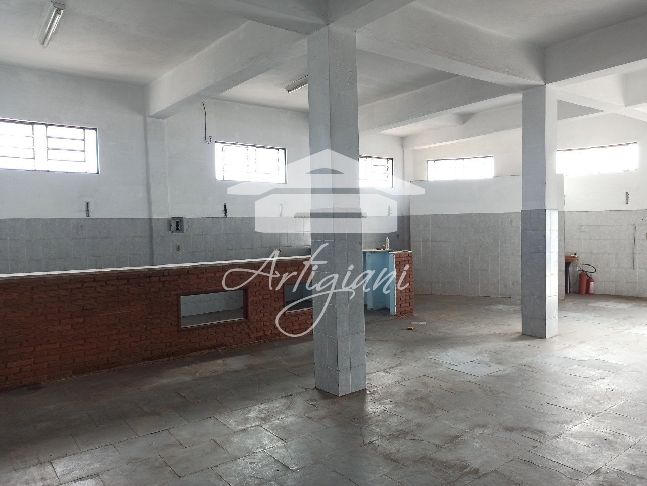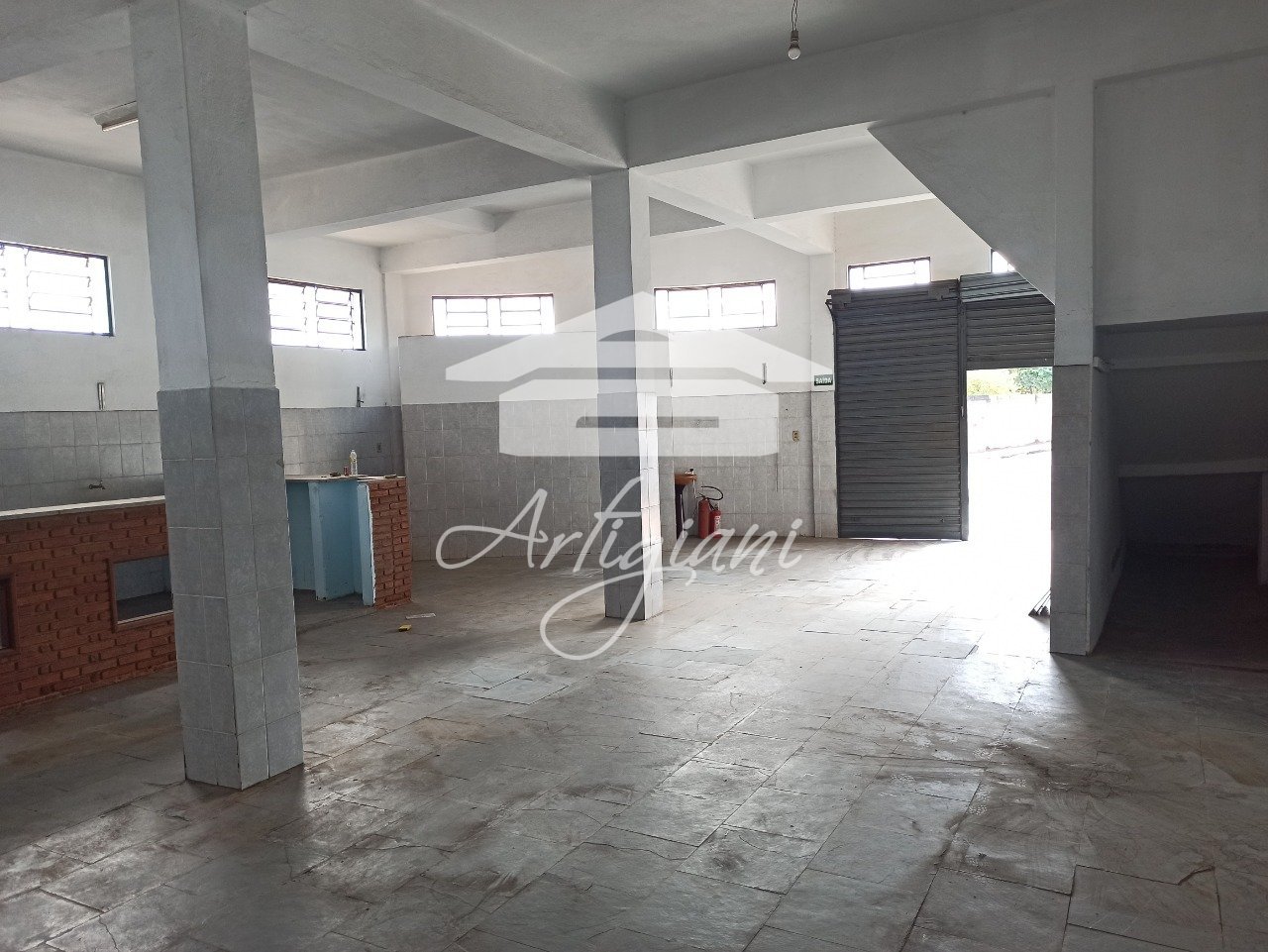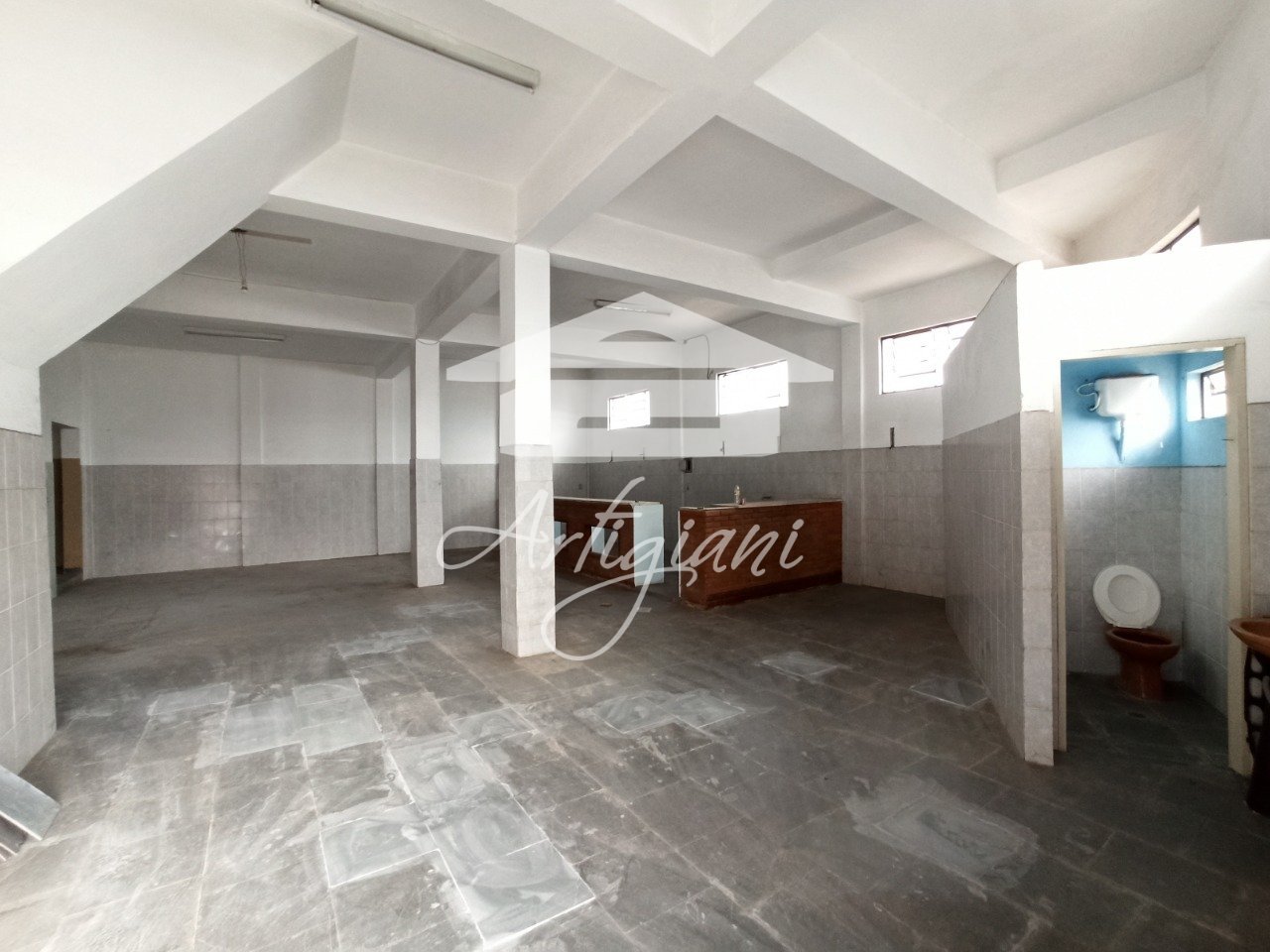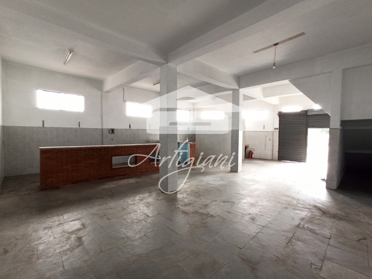 Salão comercial com aproximadamente 140 m², 2 banheiros, cozinha, balcão com pia, 4m² de pé direito.