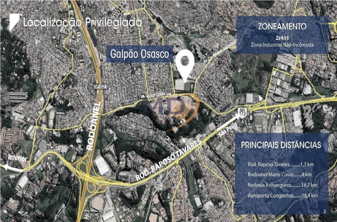 Galpão industrial/ Logístico para Locação em Osasco - São Paulo. Fácil acesso a Rodovia Raposo Tavares, Rodoanel e Marginal Pinheiros. Disponível: 1 módulo G6 - 6.297,28 m² - em Nov/2025 Piso: 05 ton/m², 8 docas. Pé direito: 12 metros. Sprinklers. 50 vagas para autos. Portaria 24 hs. Principais distâncias: Rodovia Raposo Tavares: 1,3 km. Rodoanel: 4 km. Rodovia Anhanguera: 16,7 km. Aeroporto de Congonhas: 18 km. Consulte um de nossos especialistas.