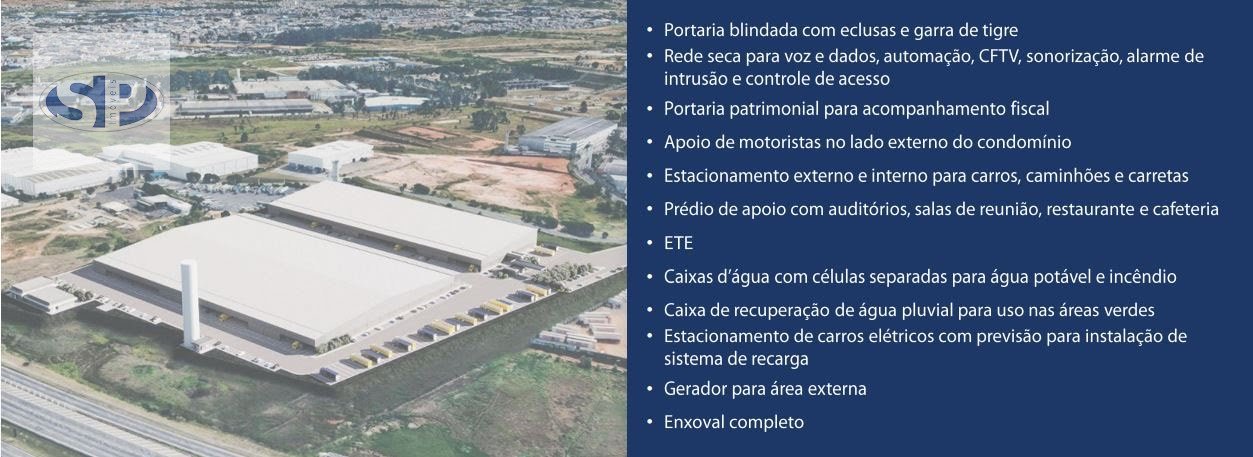 Galpão crossdocking para locação em condomínio, com 13.833m² de área total, área útil 12.148m², mezanino, área comum, 16 docas, 16 vagas para carretas, 44 vagas de carros, 4 vagas de motos. Descrição Interna: Pé direito livre de 12 m Capacidade do piso de 6 ton/m² Ventilação cruzada com 6 trocas de ar/hora Iluminação LED Iluminação Zenital Isolamento termo acústico Sistema de Sprinklers Niveladores de doca Distância entre pilares de 20 m x 21 m Mezanino sob medida.