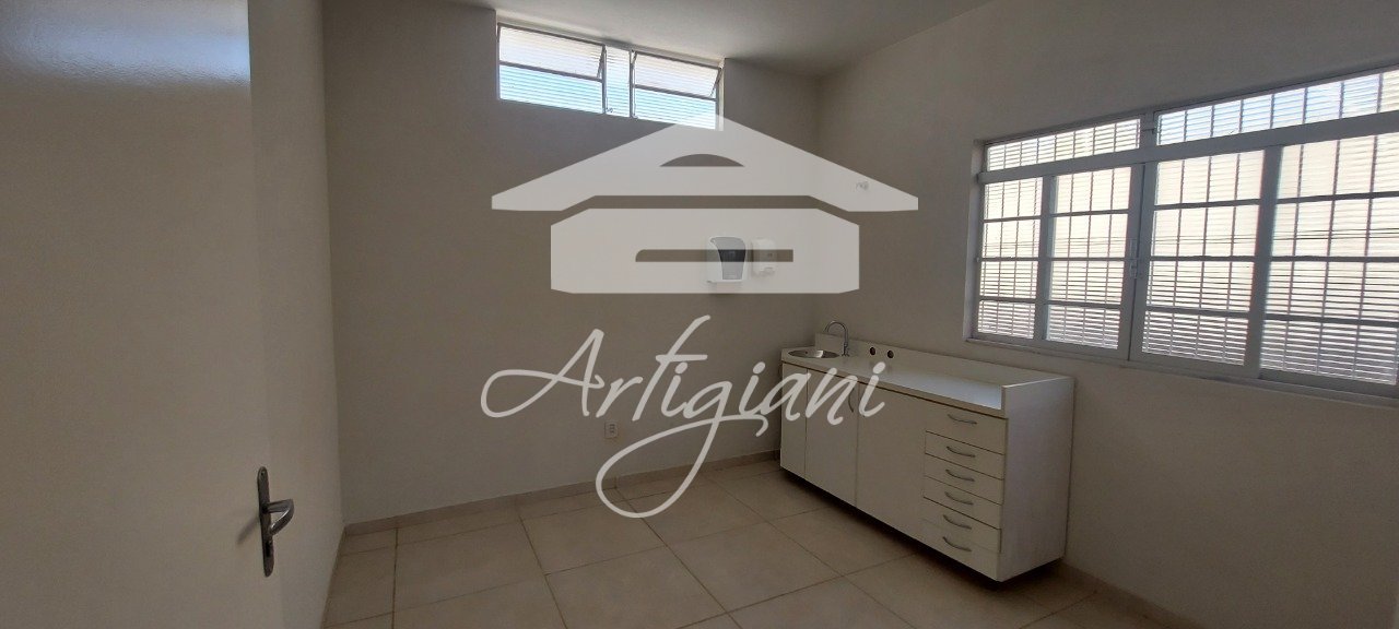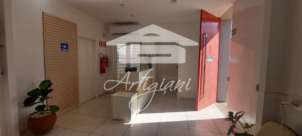 Sala para consultório, banheiro, cozinha e recepção compartilhada.