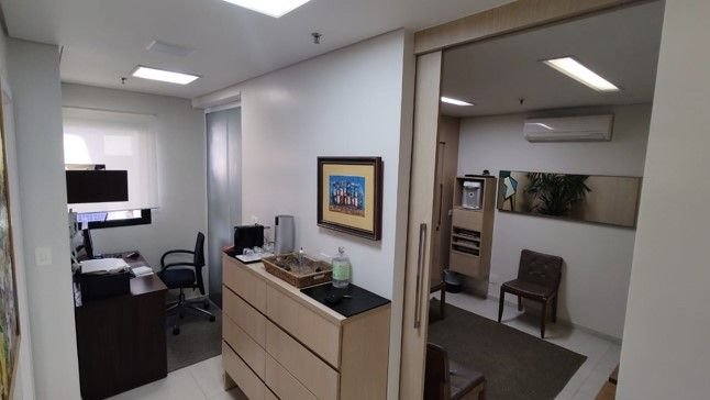 Conjunto Comercial com Área Útil de 50 m2, PARA CONSULTÓRIO MEDICO OU ODONTOLÓGICO, com distribuição interna constando: Sala de espera com acabamento em lambril, banheiro social, pontos para água filtrada, TV, internet a cabo, luz de emergência, ar condicionado, divisória para a área privativa com porta de correr de madeira. Área de distribuição com armários, armário arquivo, mesa da secretária e entrada para 2 salas de entrevistas e 1 banheiro de serviço. 2 salas de entrevistas com armário embutido, mesa com gavetas, nicho para impressora, iluminação natural e ar condicionado. 1 sala de exame com armário, cabide, iluminação natural e lavatório. Sobre o Prédio: construção de 1993, fachada com acabamento em mármore, com recuo e jardins na entrada do edifício, 12 andares de consultórios (médicos e odontológicos) e uma cobertura, 4 conjuntos por andar sendo 2 de frente e 2 de fundo. Pavimento térreo com balcão de recepção e sala de espera para os pacientes, catracas eletrônicas para acesso a dois elevadores sociais, banheiro para usuários, área externa para estacionamento dos condôminos e área administrativa. Subsolos com 3 pavimentos de garagem para condôminos e serviço de manobristas. Área de recepção para identificação dos usuários e acesso a dois elevadores sociais. Não perca mais tempo e agende já a sua visita!