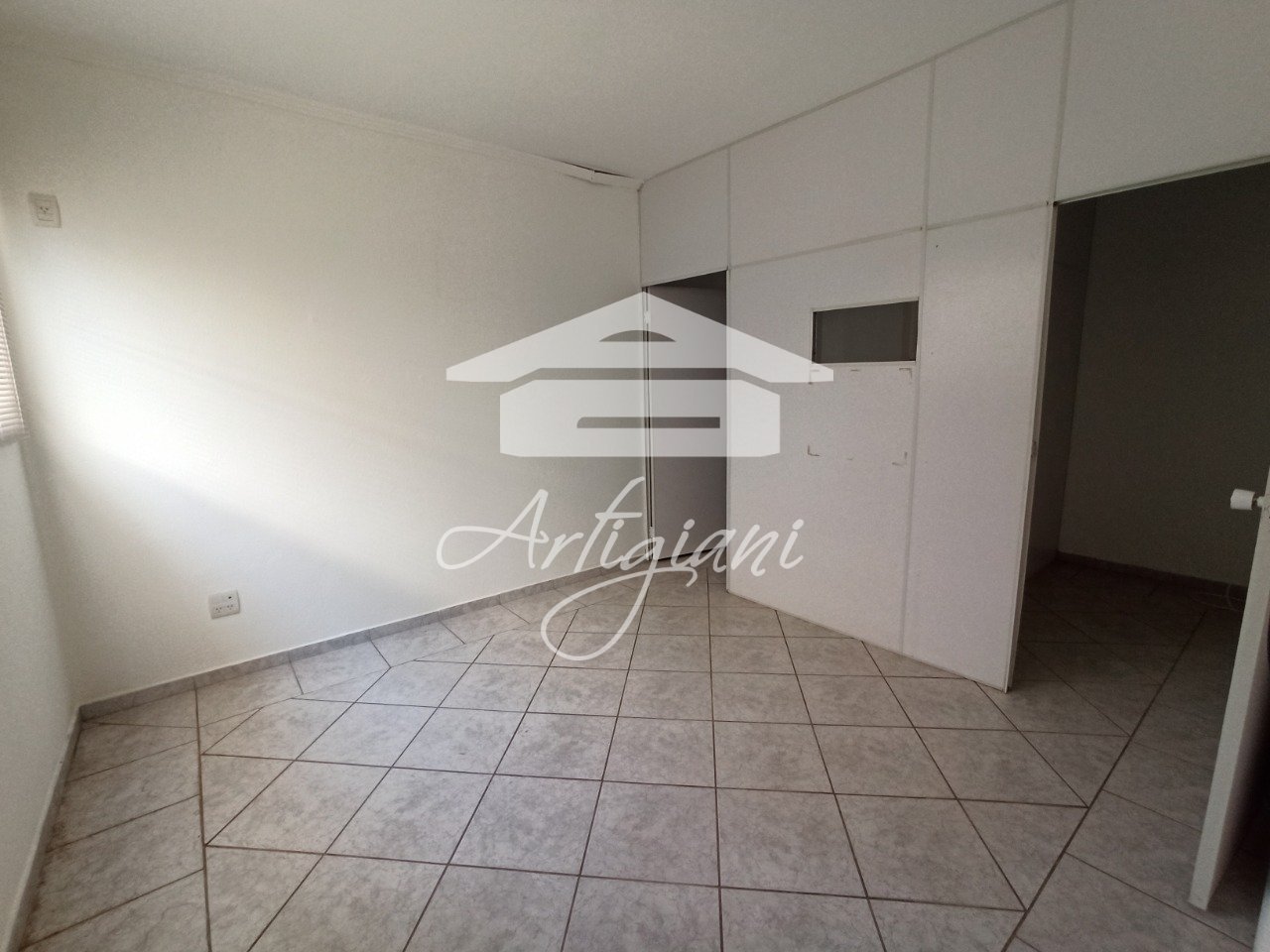 Sala com banheiro, copa, piso cerâmico, área de construção 20 m².