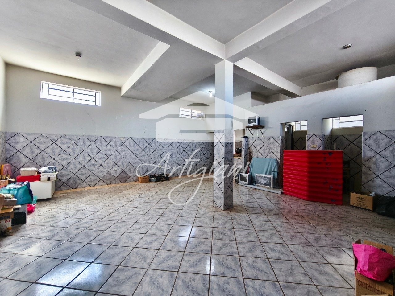 Salão com 80m² e 2 banheiros.