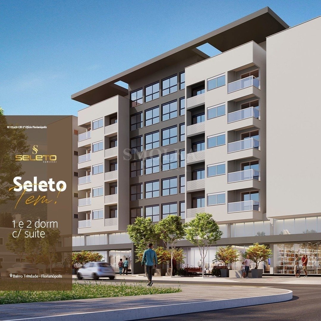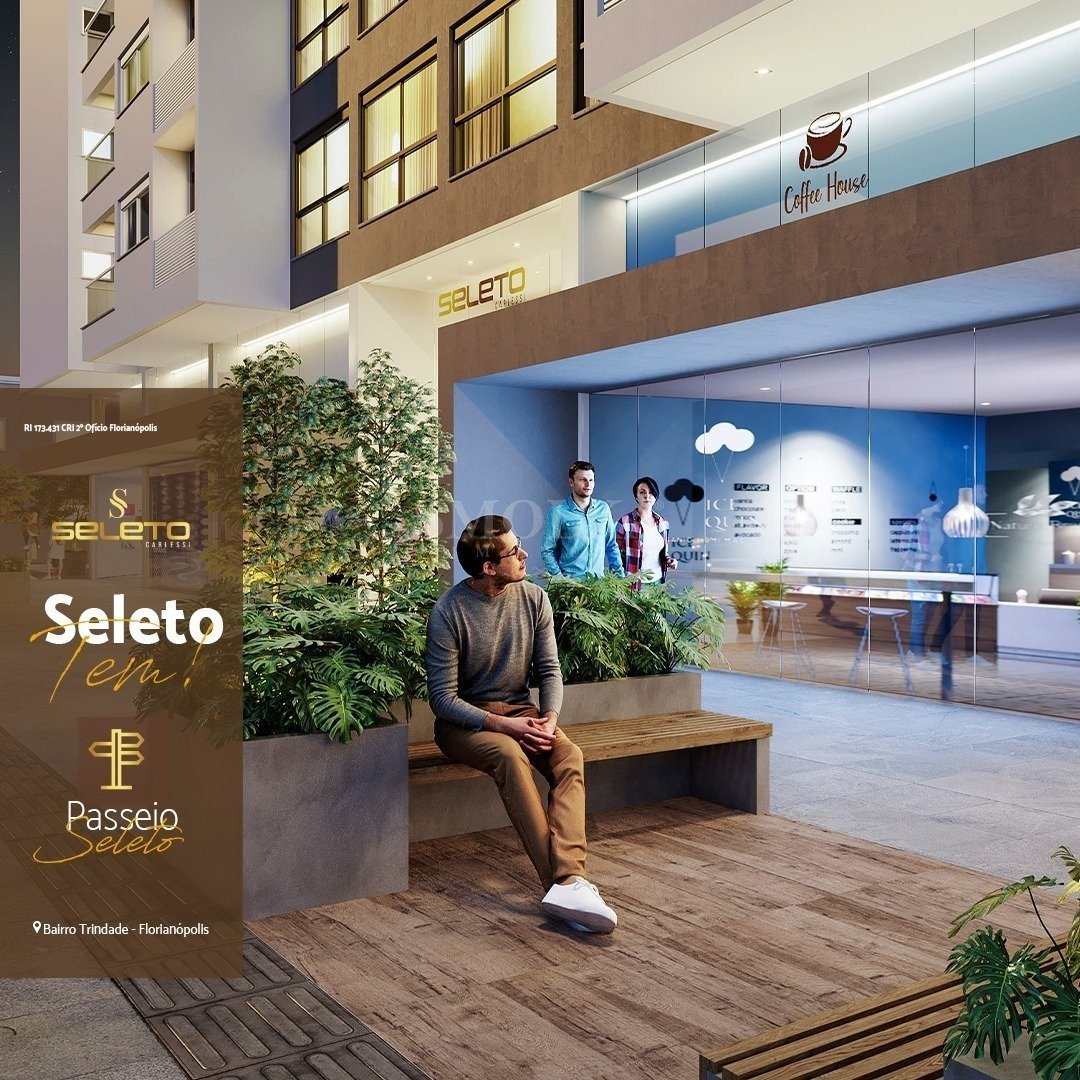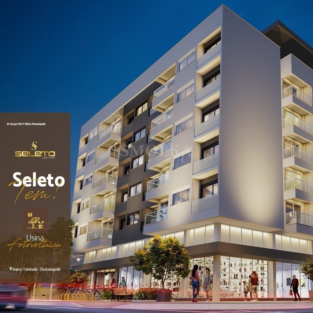 Morar na Trindade Na melhor região do bairro na Rua Conego Bernardo, entre a Santa Luzia e a rua João de Deus Machado, a uma quadra da Rua Lauro Linhares, rua principal do bairro. Situado a duas quadras da UFSC, a uma quadra do Hospital Universitário e próximo ao shopping Trindade, sua posição geográfica permite fácil deslocamento, seja a pé, carro ou transporte público. E na direção oposta, a Beira Mar norte, onde a 300 mts se encontra um shopping e a Av. Madre Benvenuta, com atrativos comerciais, gastronômicos, cinema e serviços. Seja bem-vindo ao melhor da Trindade. Edifício único de 06 pavimentos com 70 Apartamentos e 10 Lojas; Linhas arquitetônicas modernas e com qualidade nos materiais; Projeto cuidadosamente desenvolvido nos detalhes e especificações; Conceito de uso misto, oferta de comércio e serviços essenciais com lojas comerciais no pavimento térreo; Coworking integrado com jardim interno; Usina Fotovoltaica para abastecimento de áreas comuns; Fachada com revestimento em cerâmica e textura acrílica; Completa infraestrutura; Sistema de segurança e monitoramento; Hall de Entrada amplo com pé direito duplo; Ambientes sociais no Rooftop mobiliados e decorados; Vagas para Visitantes com tomada de carregamento elétrico; Dois elevadores de alto desempenho; Banhos e vestiários para funcionários; Captação pluvial para lavação de áreas comuns; Piscina aquecida; Persiana elétrica; Persianas elétricas nos dormitórios e suítes; Acesso com fechadura digital; Porcelanato retificado nos pisos; Medidores individuais de energia, gás e água; Espera para aquecedores de água a gás (02 dormitórios); Espera para climatização por split; Esquadrias Panorâmicas de alumínio; Varanda com espera para grill elétrico; Lajes com atenuante acústico; 01 vaga de automóvel por apartamento; 02 vagas de bike privativa por apartamento; Opção de vaga de moto privativa; 03 vagas de visitantes com conector elétrico; Apartamentos de 37,66 até 67,92m²; 2 dorms (com suíte) e 1 dorm (com suíte); Áreas sociais/lazer mobiliadas; Conheça o Rooftop, espaços planejados para